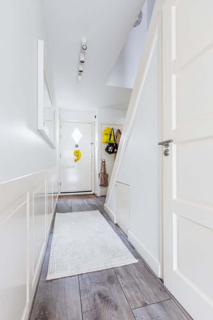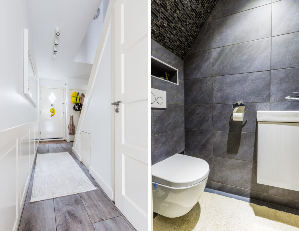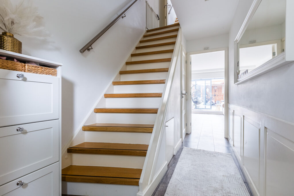Via de fraai aangelegde voortuin bereik je de (fietsen)berging en voordeur van deze charmante woning. Na binnenkomst word je verwelkomd in een ruime, keurig afgewerkte entreehal met meterkast, trap naar de eerste verdieping, een luxe toiletruimte met zwevend toilet en fonteintje, en toegang tot de woonkamer.
