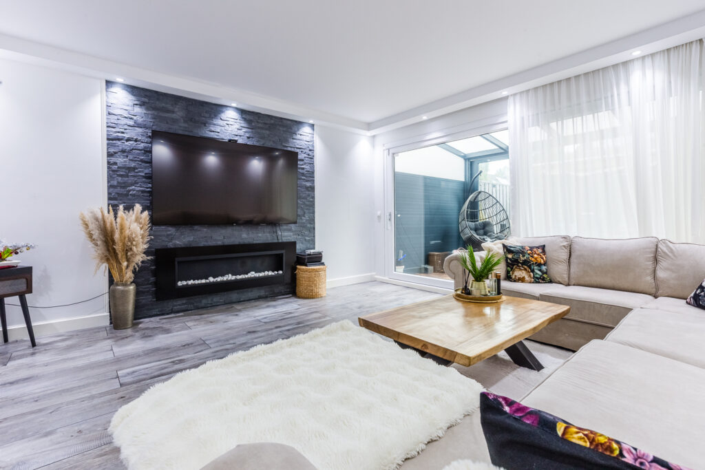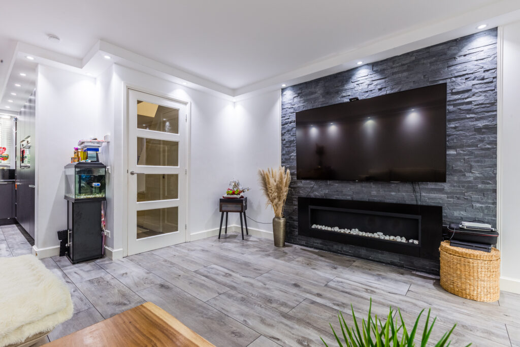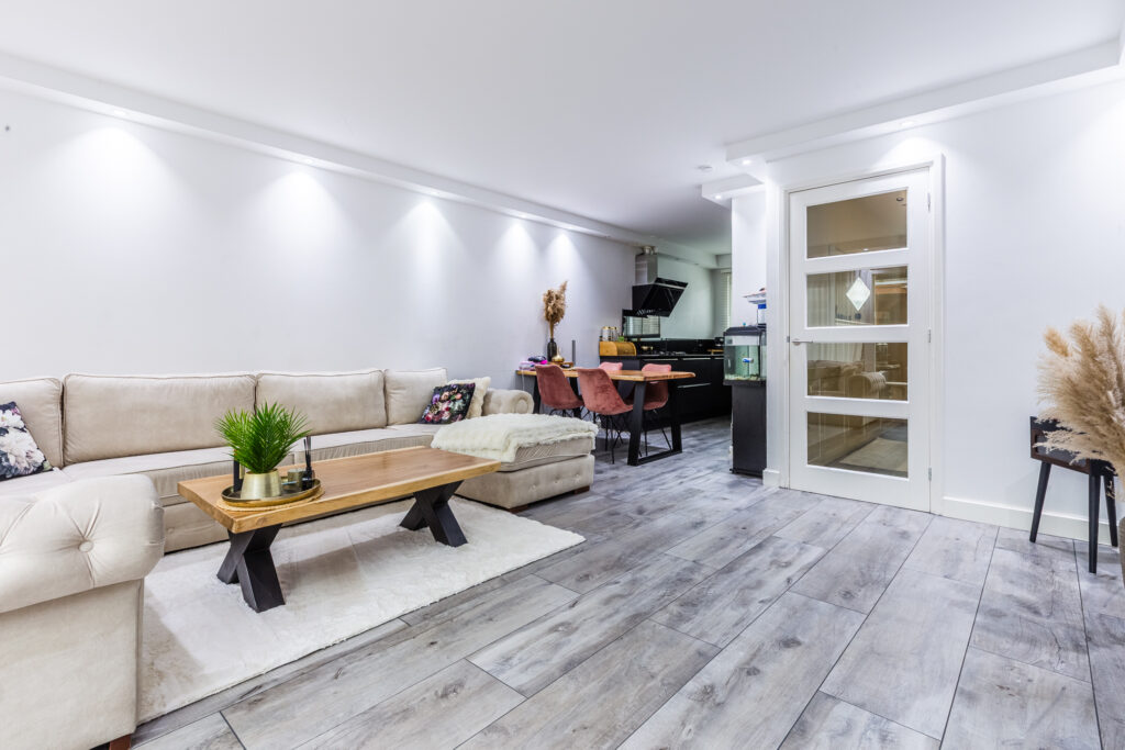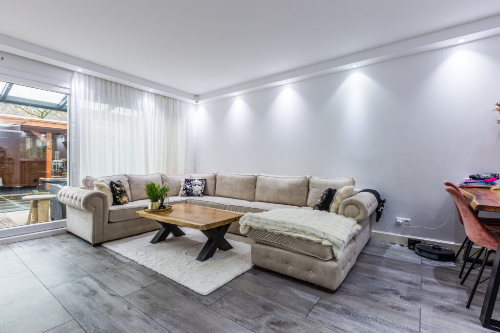 In de ruime woonkamer ligt een prachtige grijze tegelvloer met vloerverwarming. De wanden zijn voorzien van strak stucwerk. Dankzij de raampartij aan de voorzijde en de grote schuifpui aan de achterzijde is de woonkamer heerlijk licht. Verder wordt de ruimte verlicht met mooie inbouwspots.