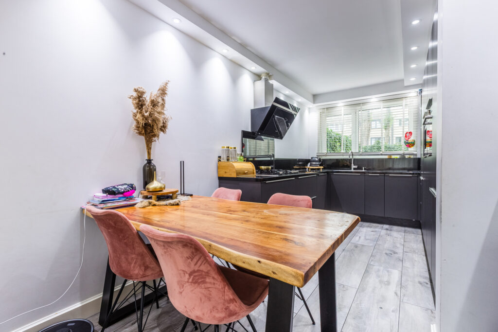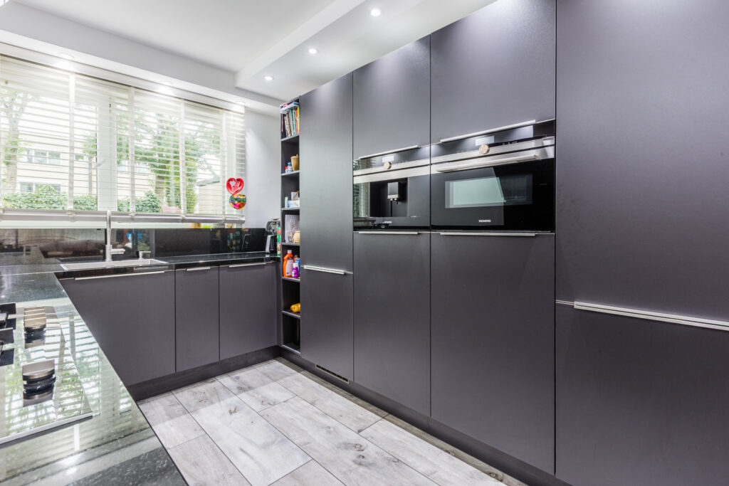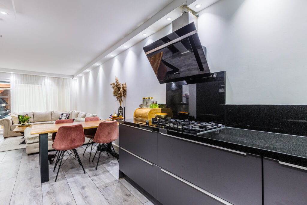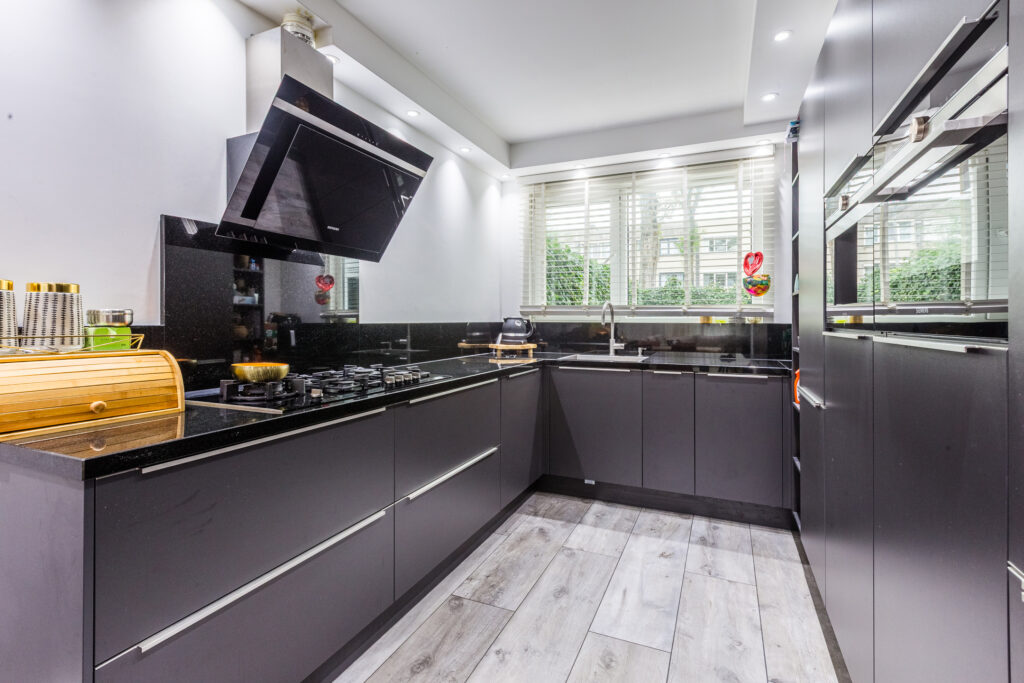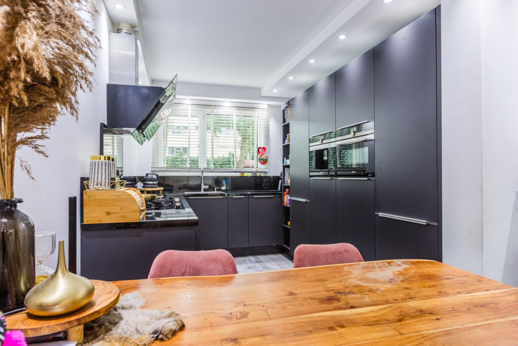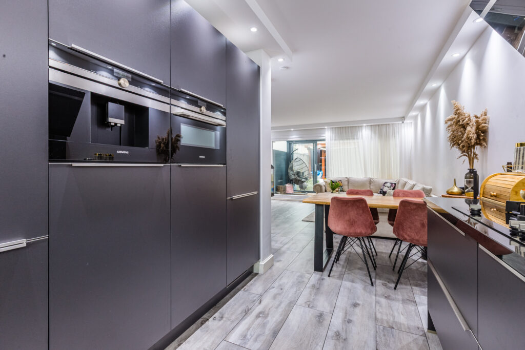 De open keuken bevindt zich aan de voorzijde van het huis. Deze keuken is in 2018 vernieuwd en bestaat uit een keukenblok en een kastenwand. Het geheel heeft een strak, zwart design. Moderne apparatuur is er in de vorm van een vaatwasser, oven, magnetron, gasfornuis, afzuigkap, koelkast en vriezer.