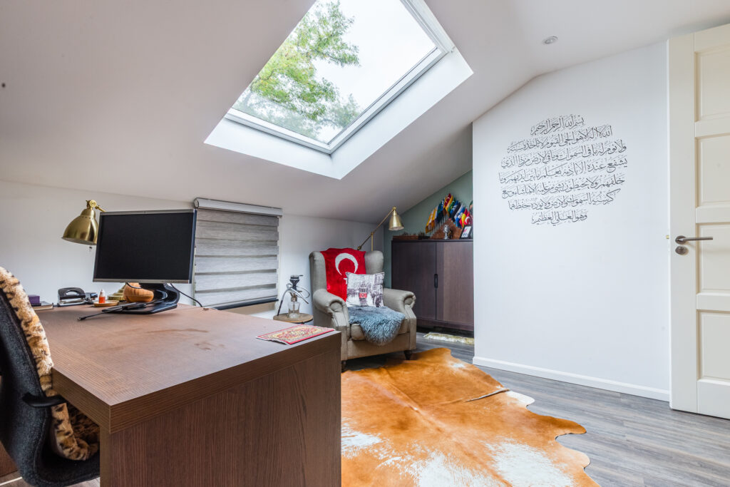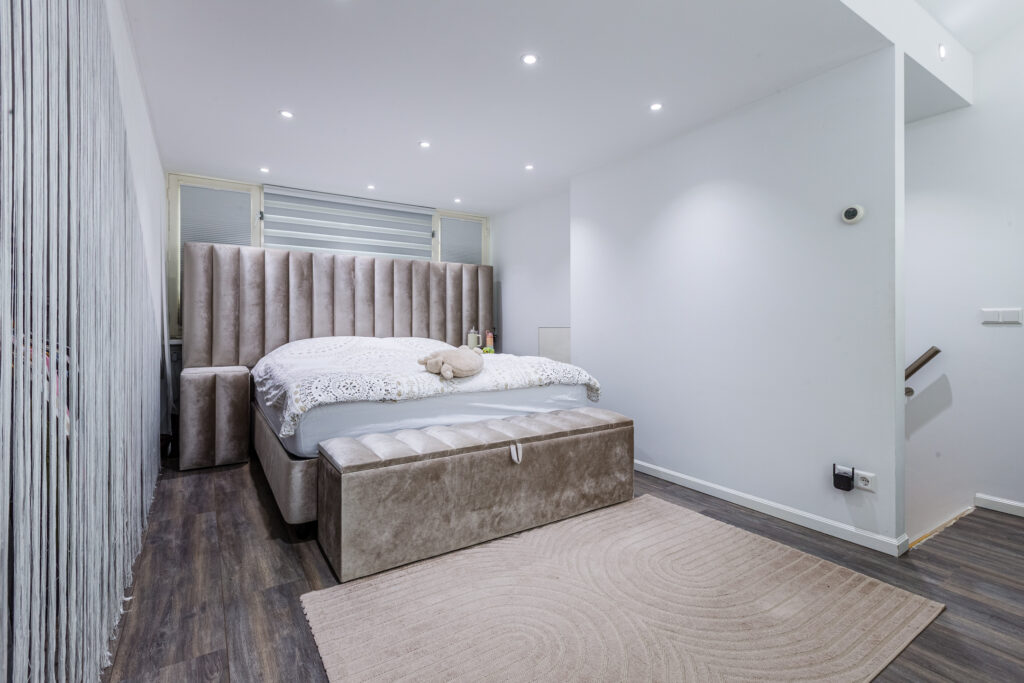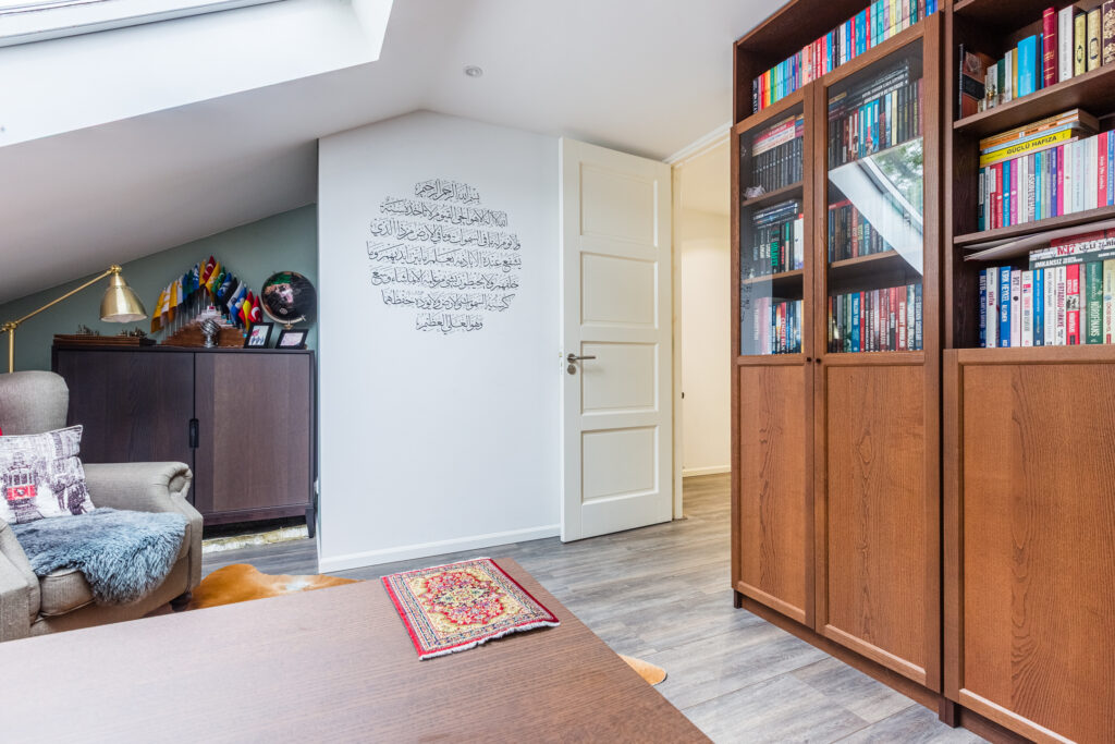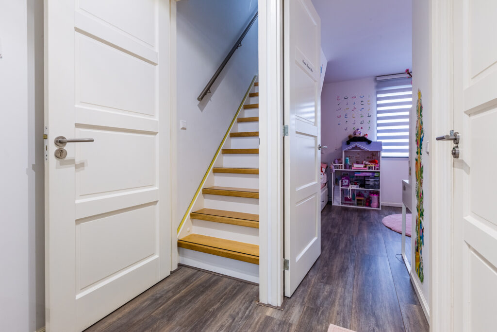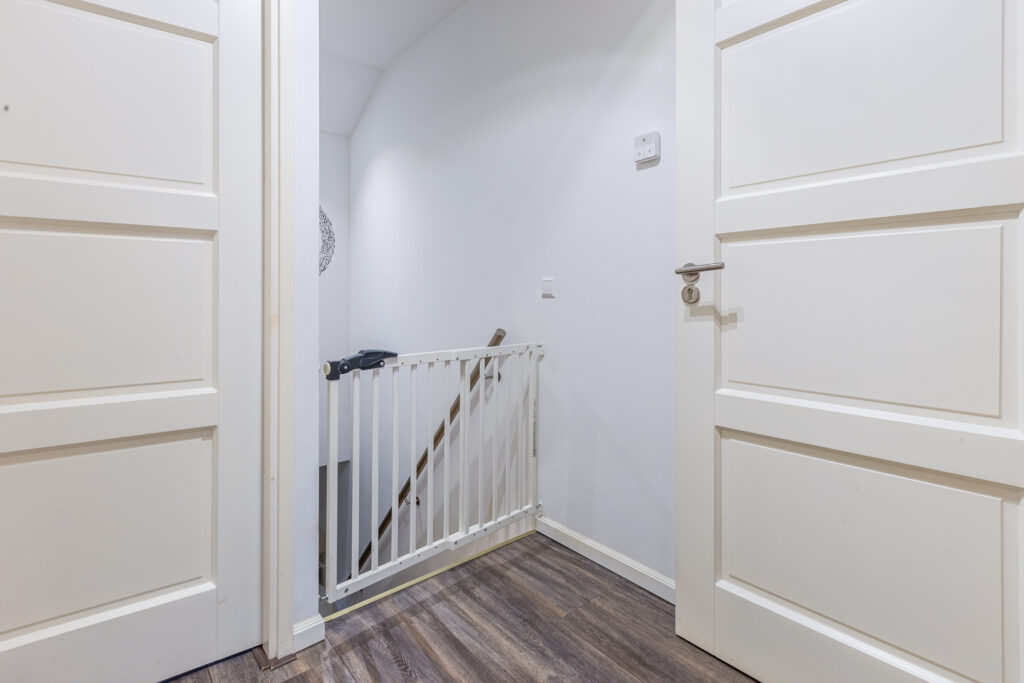 De vaste trap leidt tot de overloop van de tweede verdieping. De zolder is ruim opgezet en wordt momenteel gebruikt als extra slaapkamer. Aan de voorzijde is een dakkapel geplaatst, wat zorgt voor extra licht en ruimte. De hele zolder is fraai afgewerkt en wordt verlicht met inbouwspots.
