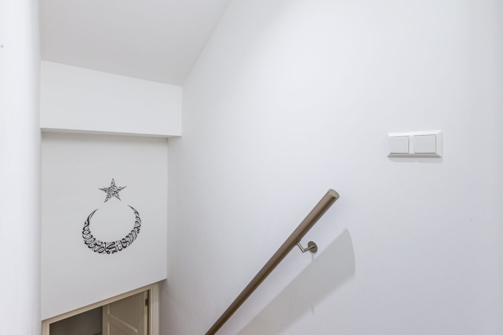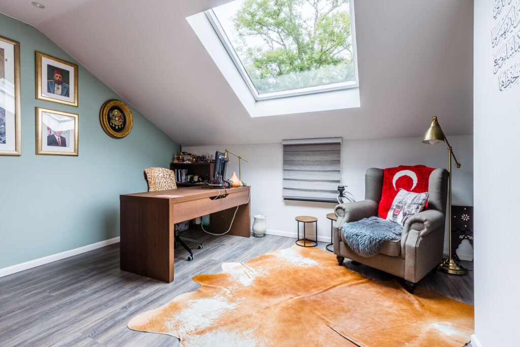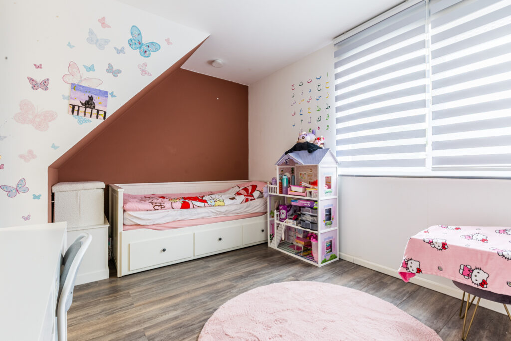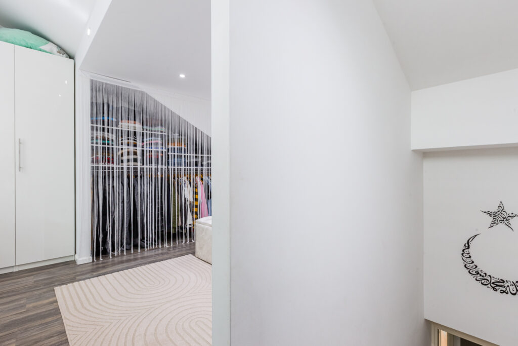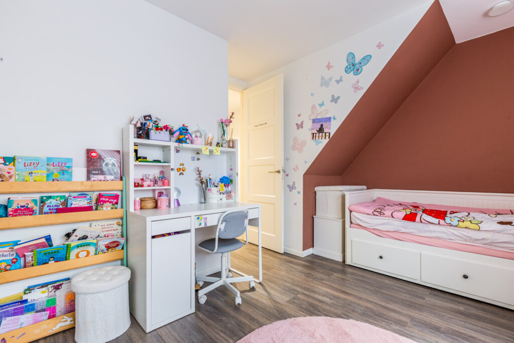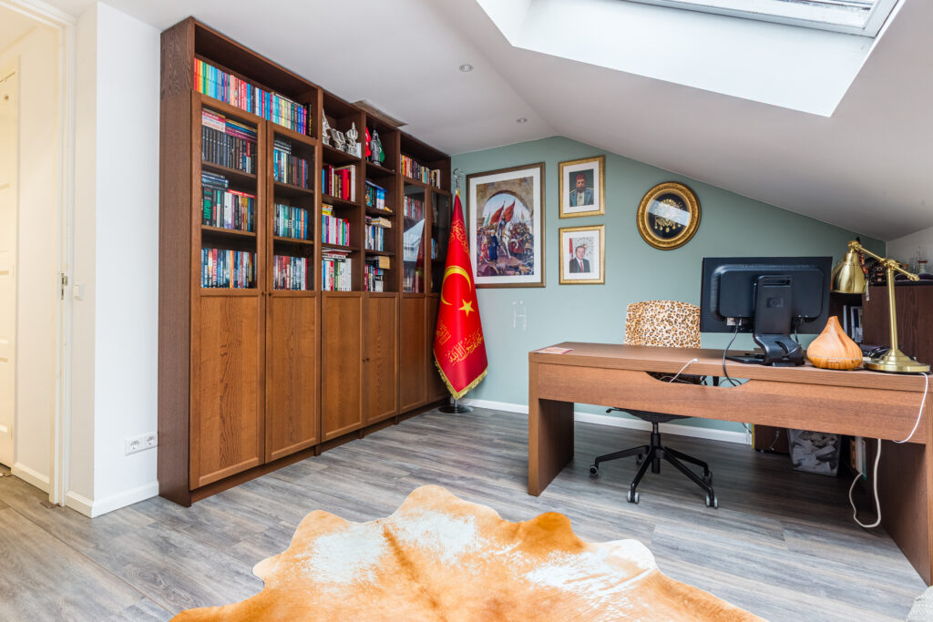 De vaste trap leidt tot de overloop van de tweede verdieping. De zolder is ruim opgezet en wordt momenteel gebruikt als extra slaapkamer. Aan de voorzijde is een dakkapel geplaatst, wat zorgt voor extra licht en ruimte. De hele zolder is fraai afgewerkt en wordt verlicht met inbouwspots.