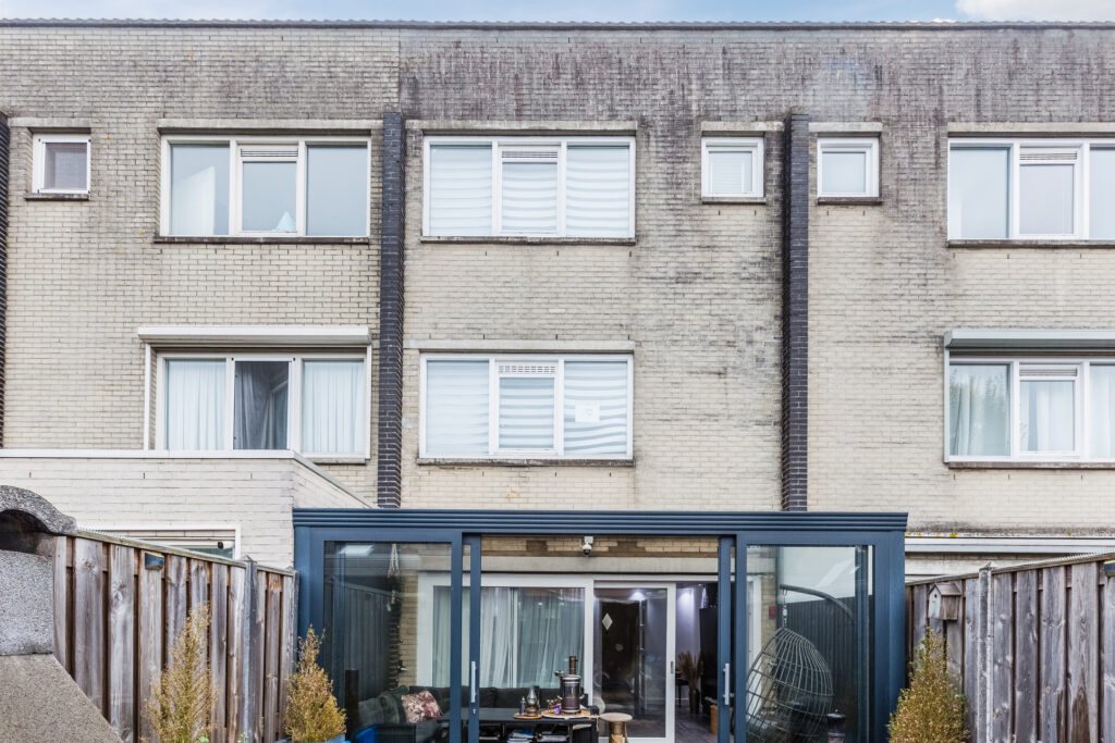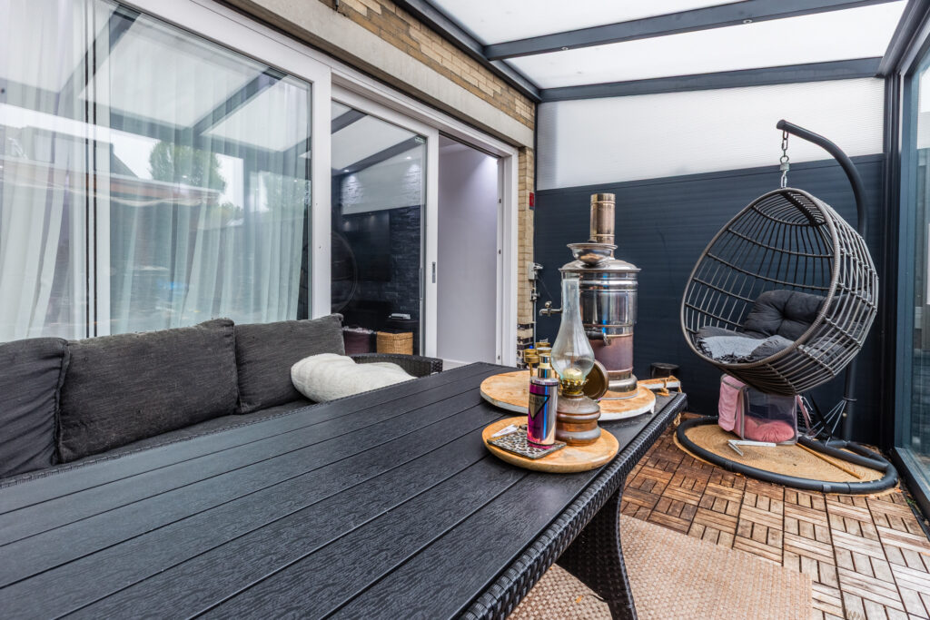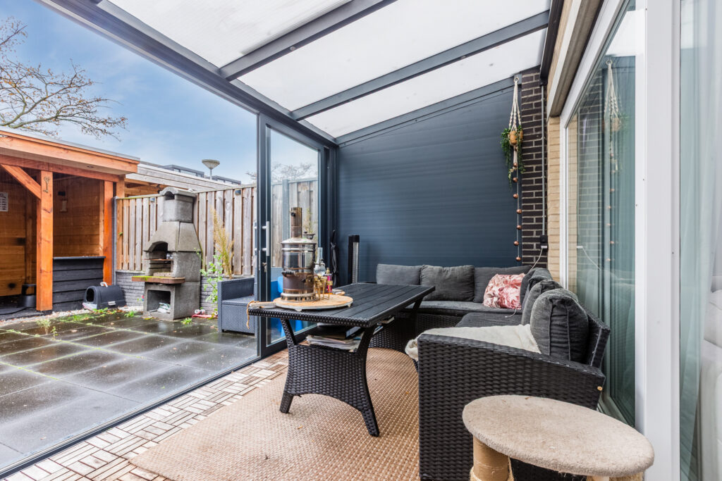 De schuifpui aan de achterzijde van de woonkamer geeft toegang tot de serre. Deze ruimte vormt de perfecte verbinding tussen het binnen- en buitenleven. De serre is fraai afgewerkt en voorzien van grote glaspartijen en glazen schuifdeuren.