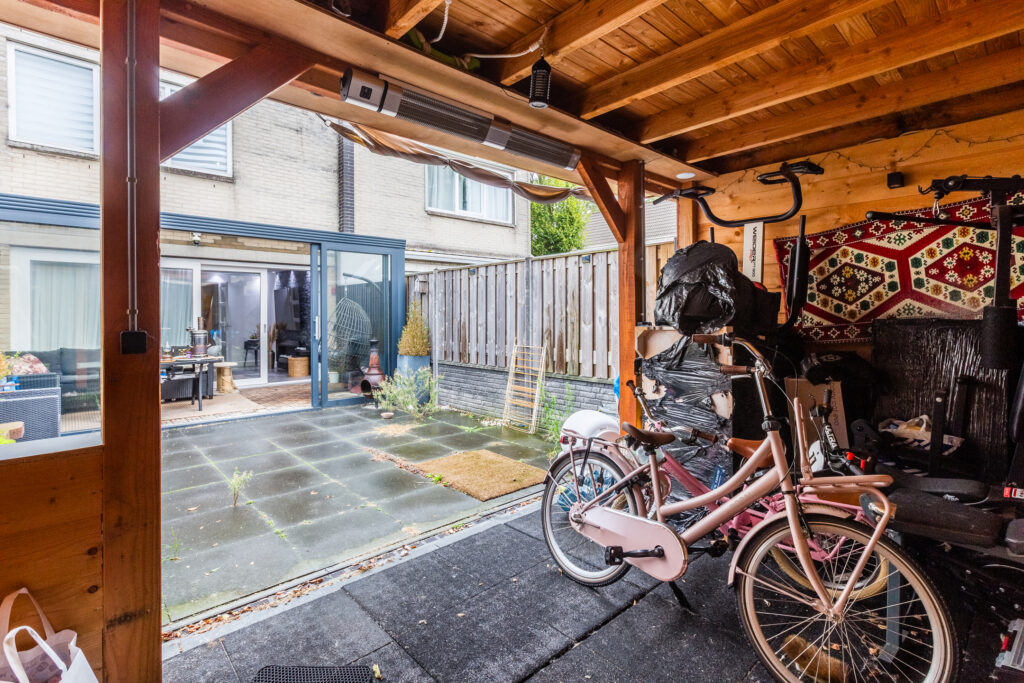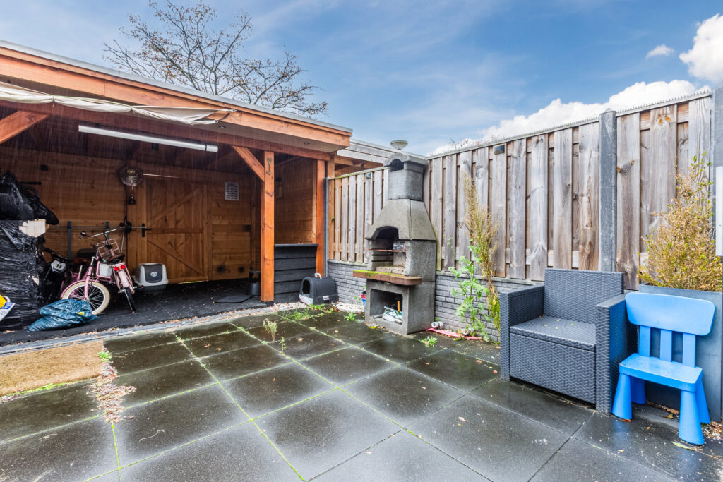 Achterin de tuin staat een houten overkapping. Hier heb je de mogelijkheid om een overdekte loungeplek te creëren of om spullen op te bergen. De tuin is bereikbaar via een achterom.