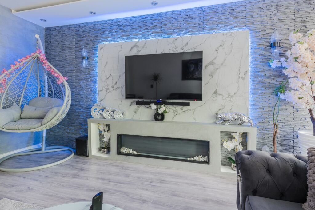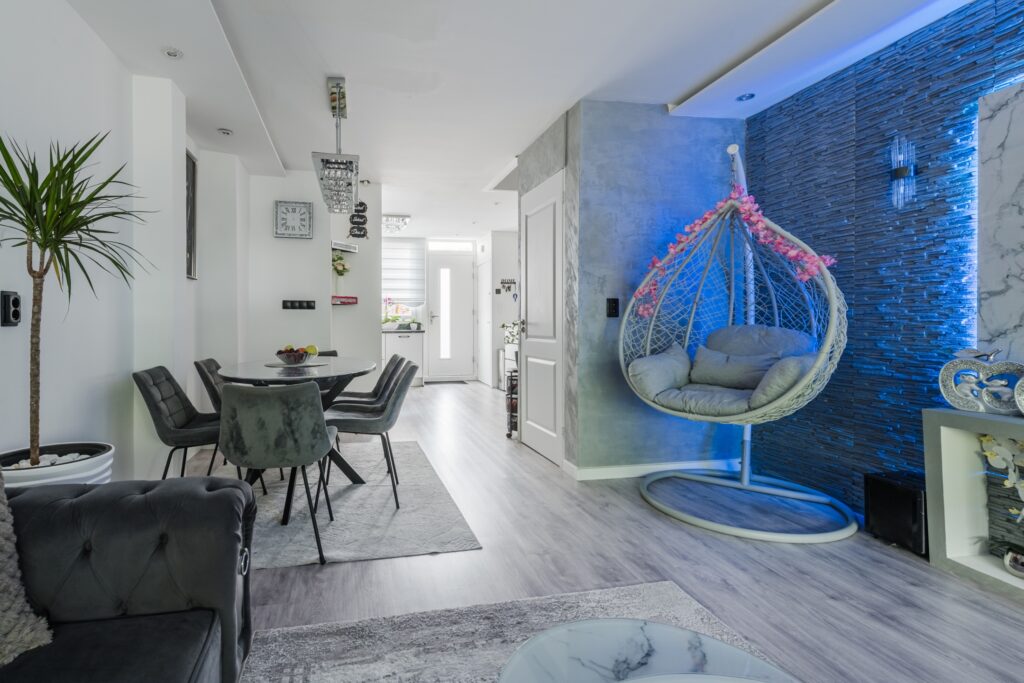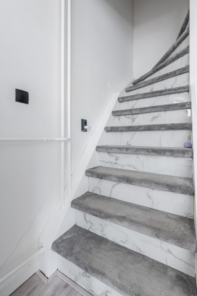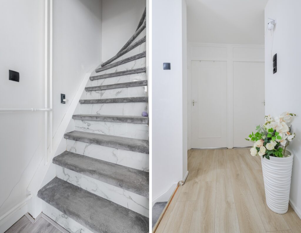 In de woonkamer bevindt zich de trap naar de tweede verdieping en een praktische trapkast.
