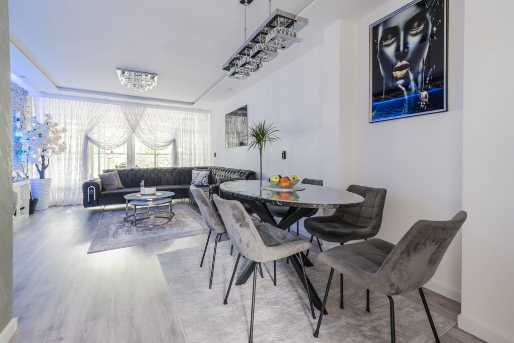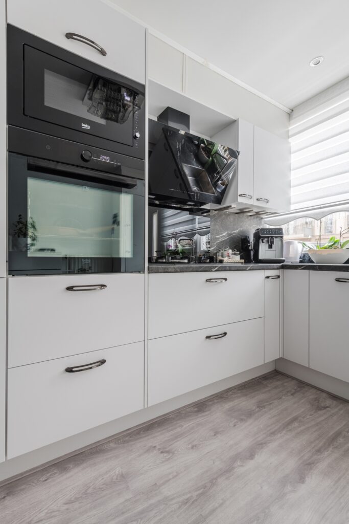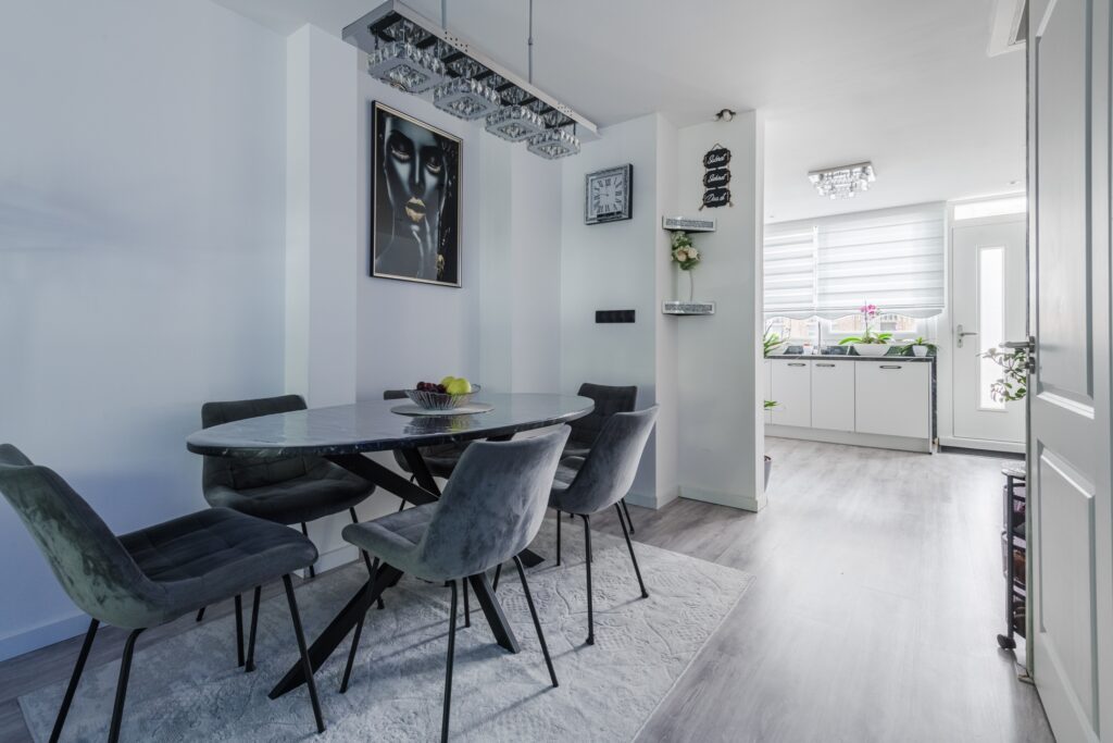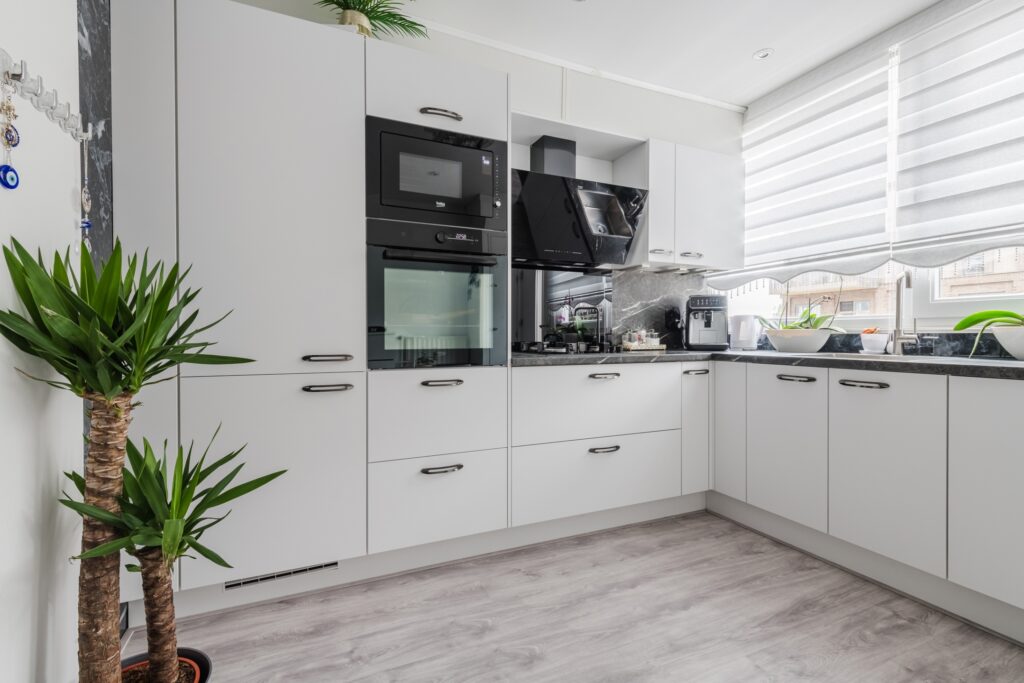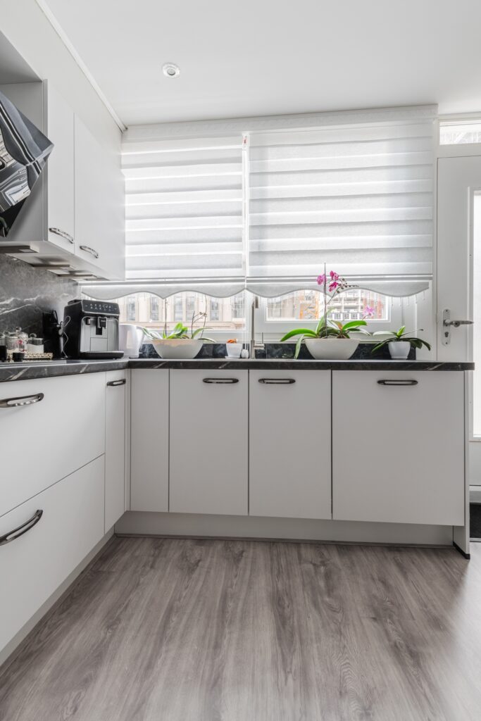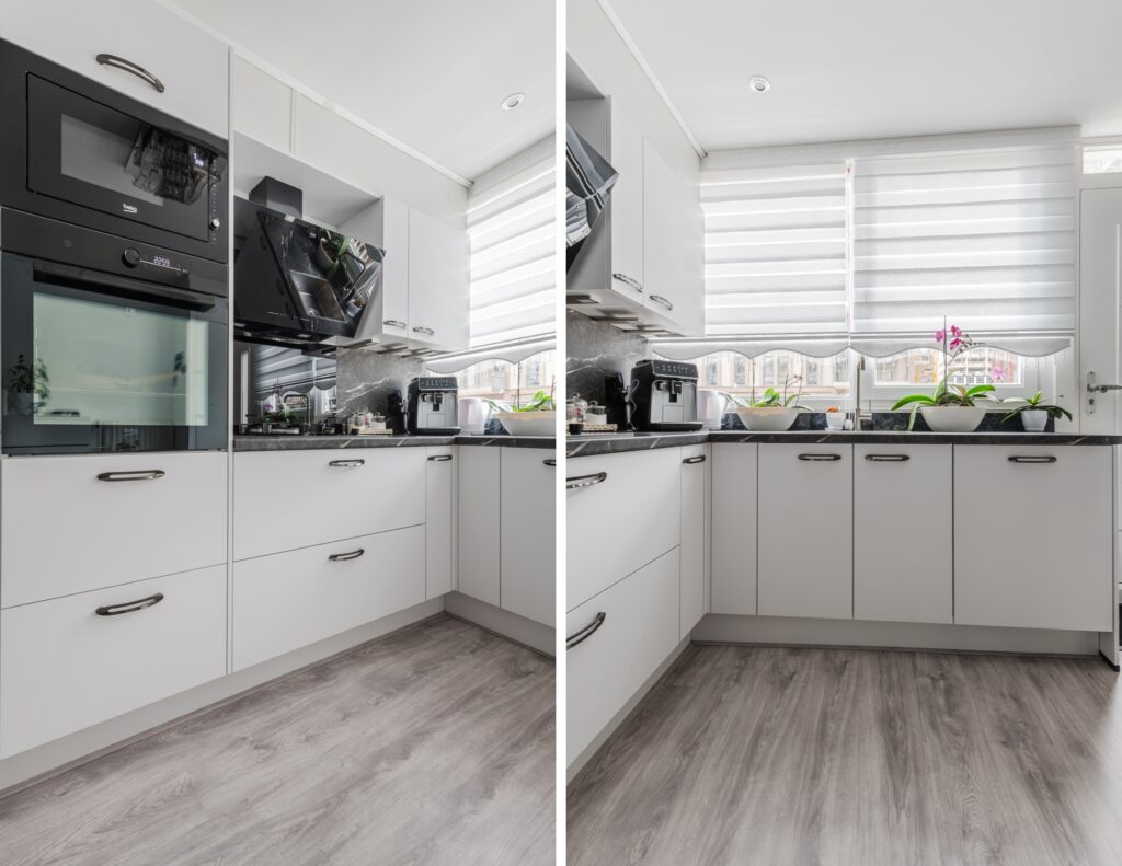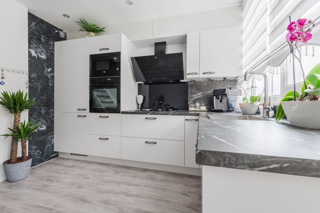 De keuken is eind 2024 vernieuwd en uitgevoerd in een hoekopstelling. De hoekkeuken heeft een fraai design met witte keukenkastjes en een donker werkblad. Je treft hier de volgende apparatuur aan: vaatwasser, oven, magnetron, gasfornuis, koelkast en vriezer.