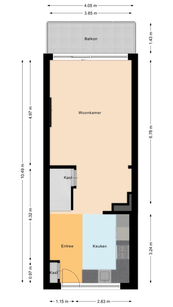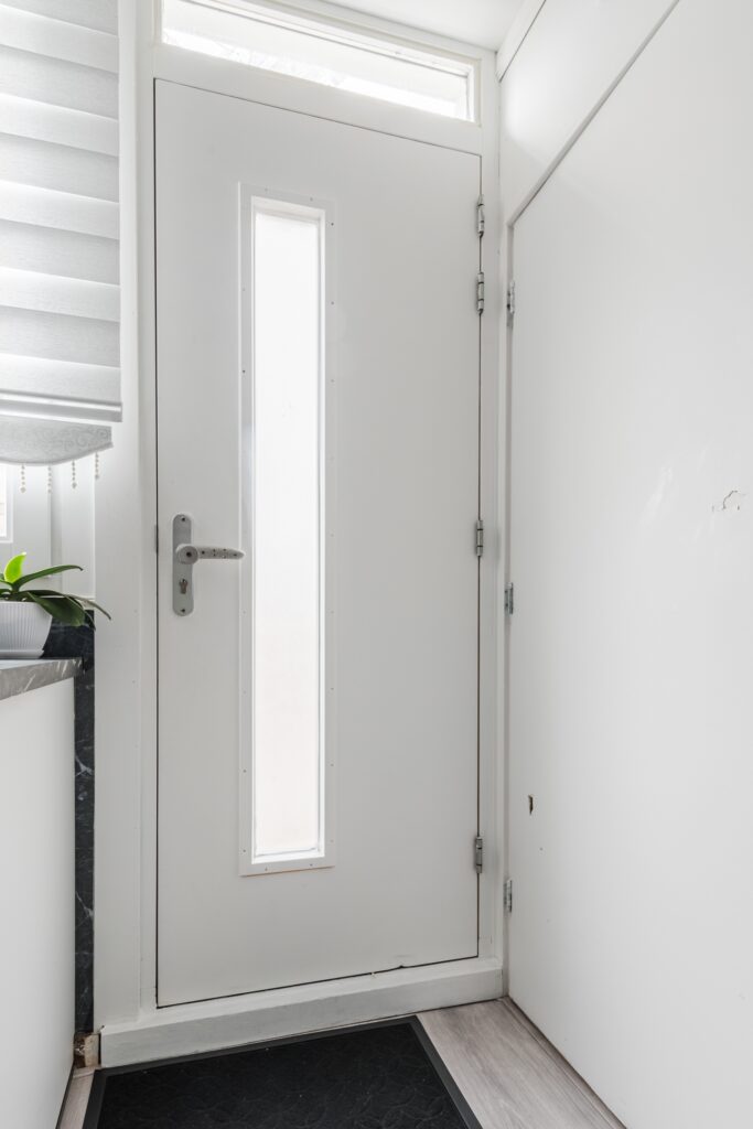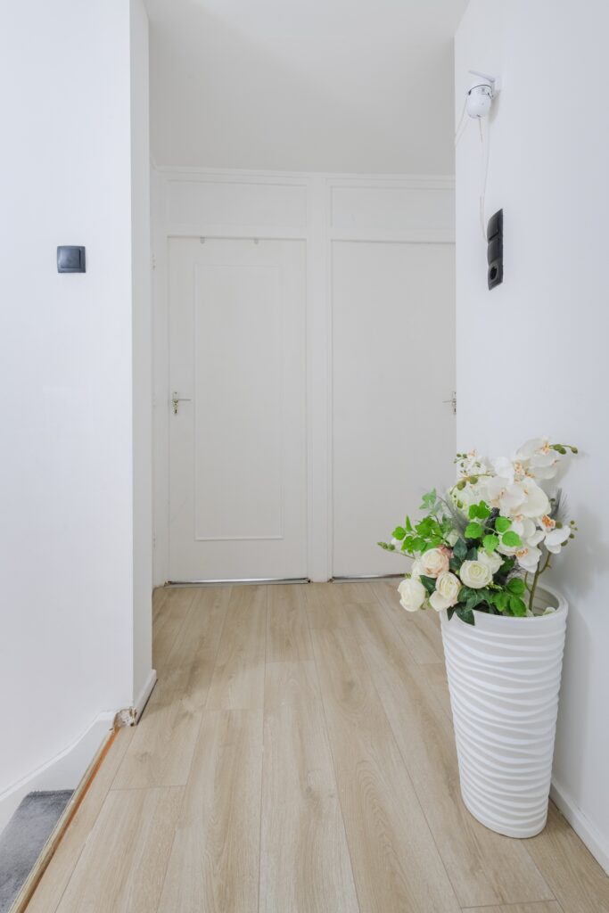 Via het trappenhuis of de lift bereik je de eerste verdieping van het complex, waar de voordeur van het appartement zich bevindt. Na binnenkomst beland je in een fraai afgewerkte entreehal met bergkast. Je loopt vrijwel direct de open keuken binnen.