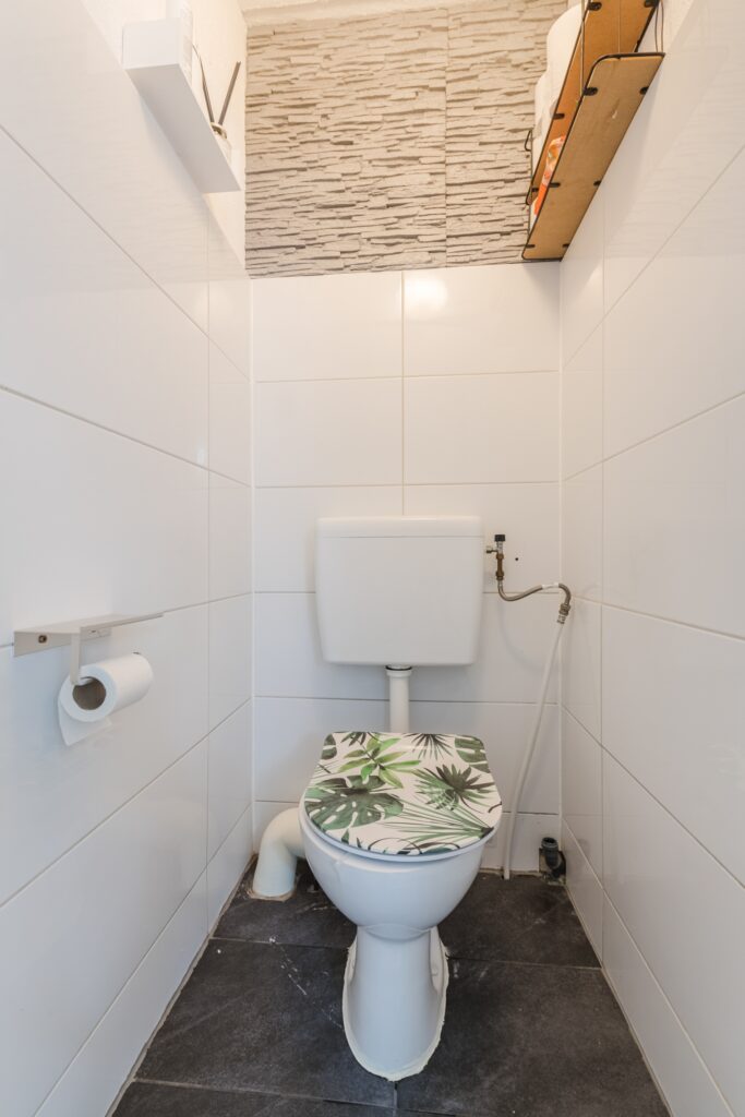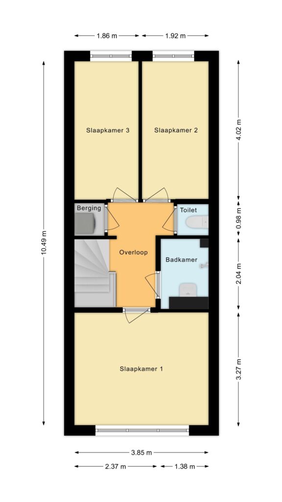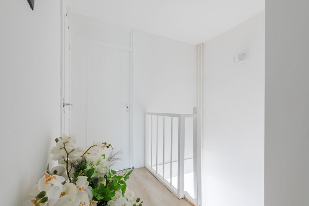 De trap in de woonkamer biedt toegang tot de overloop van de tweede verdieping. Op deze verdieping vind je drie slaapkamers, een badkamer, een bergkast en een toiletruimte met staand toilet.
