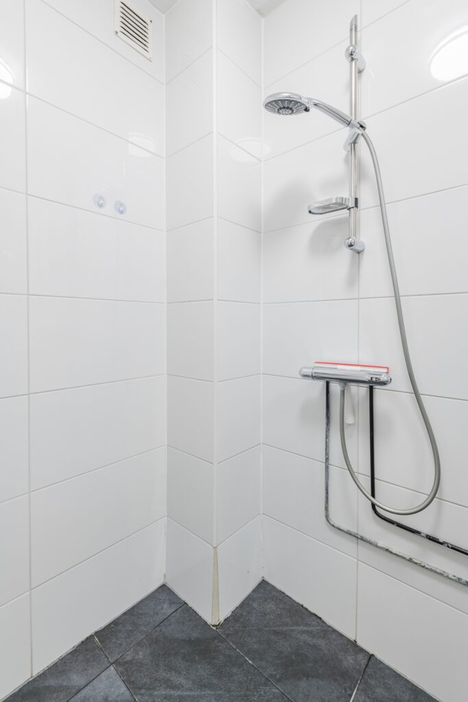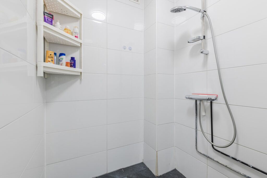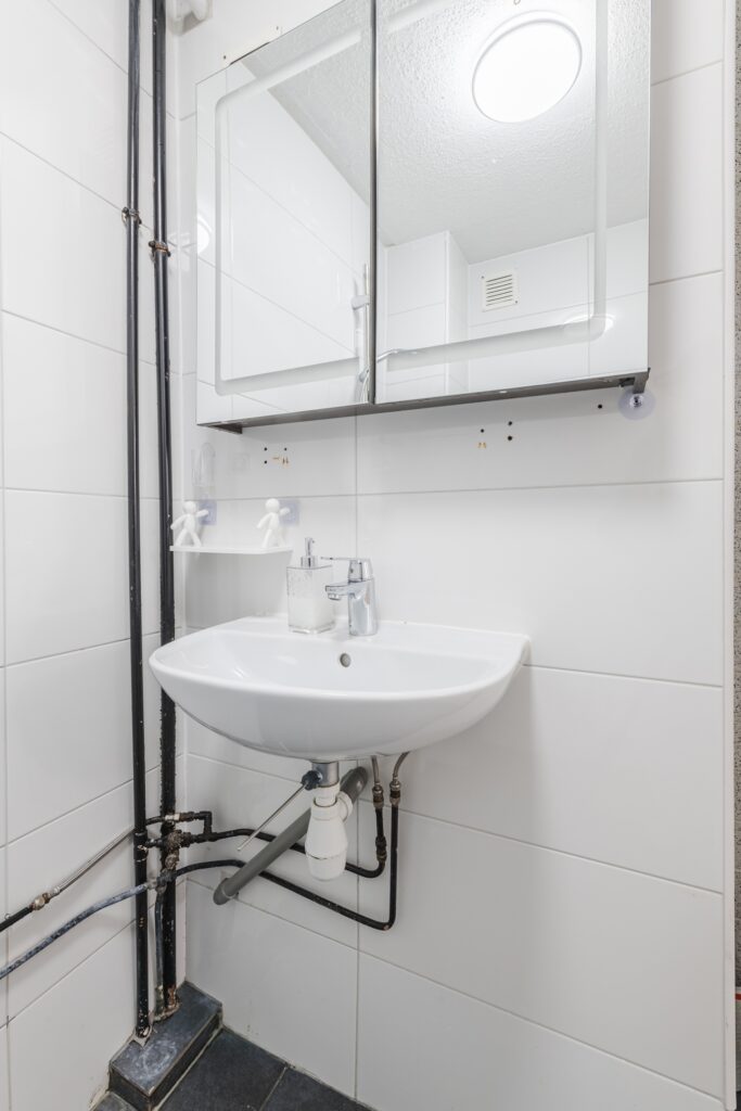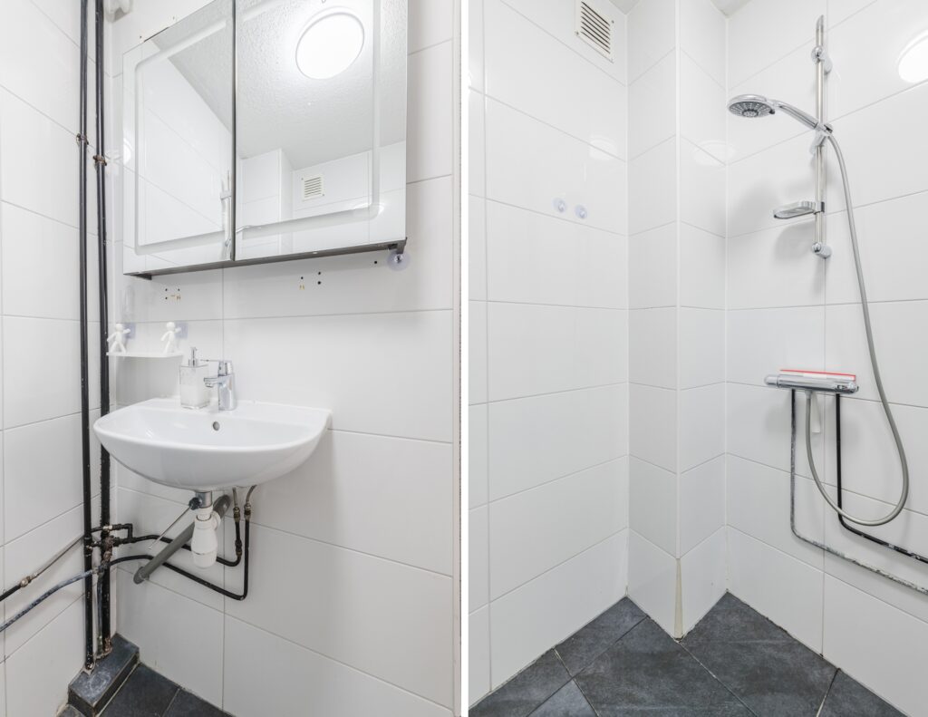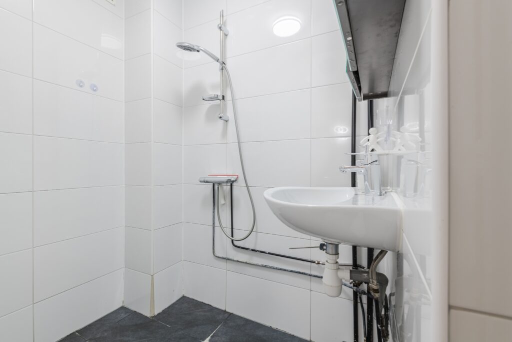 De badkamer is voorzien van donkere vloertegels en witte wandtegels. In deze ruimte tref je een wastafel en douche aan.