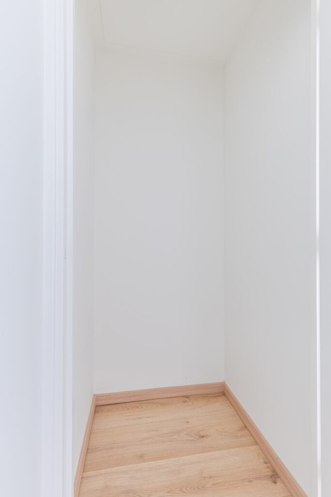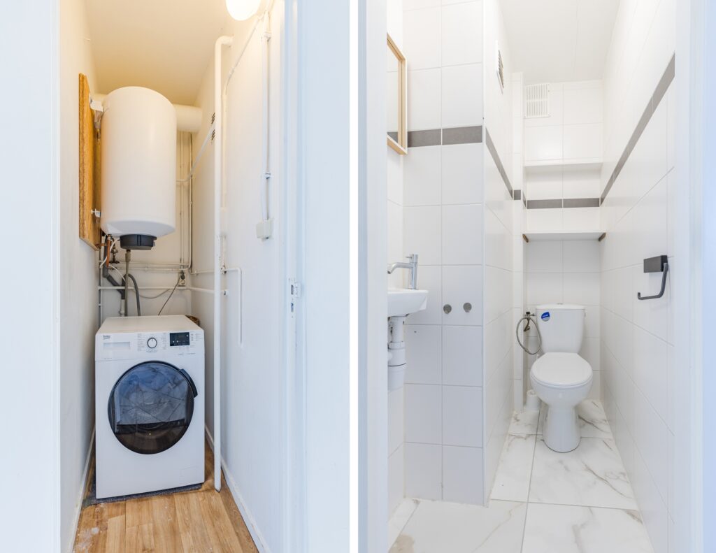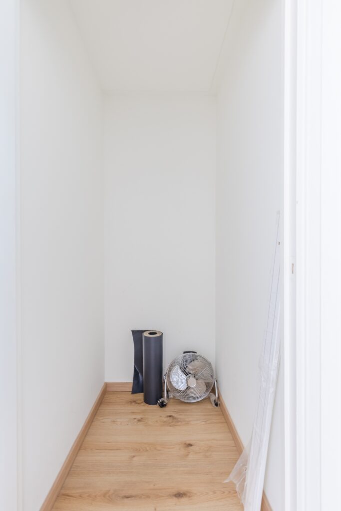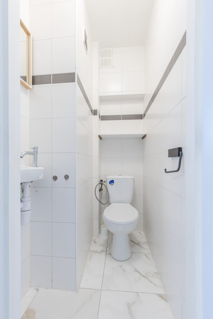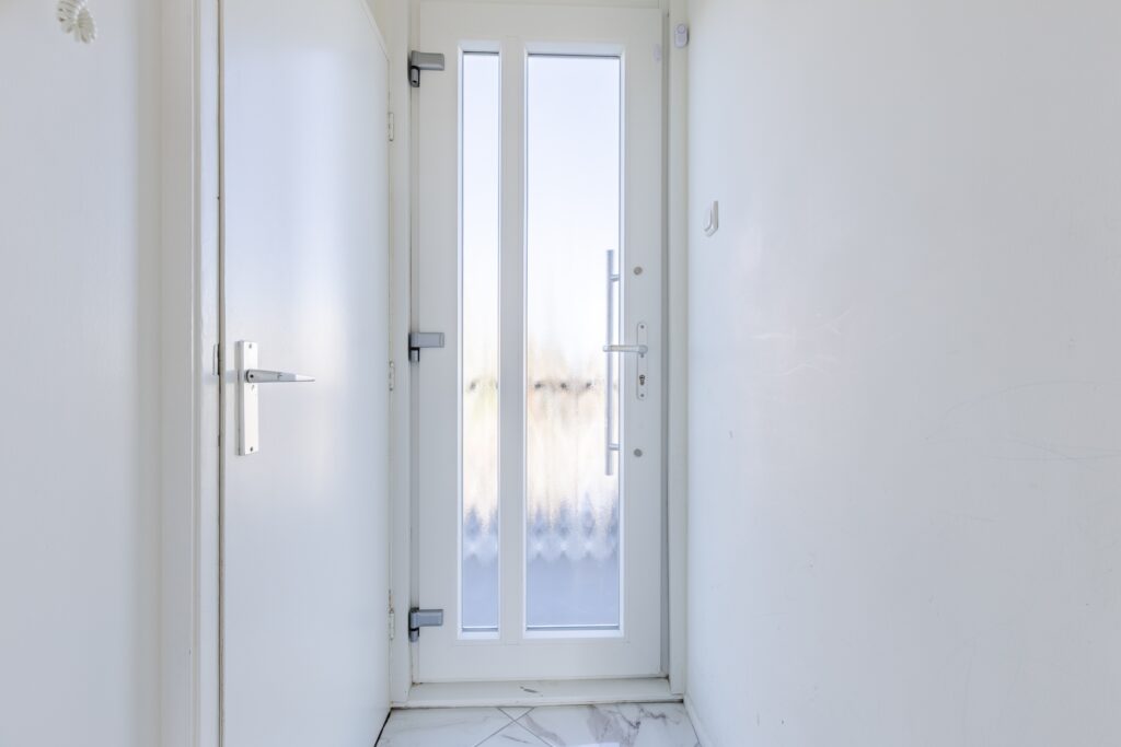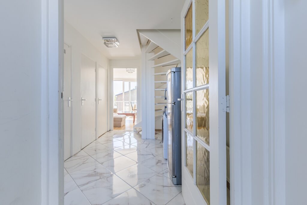 Achter de voordeur van het appartement bevindt zich een kleine entreehal met meterkast en toegangsdeur naar een andere hal. De tweede hal biedt toegang tot alle vertrekken. De hallen zijn fraai afgewerkt met een lichte tegelvloer en strak stucwerk op de wanden. Via de grote hal bereik je twee bergingen en een toiletruimte met staand toilet en fonteintje.