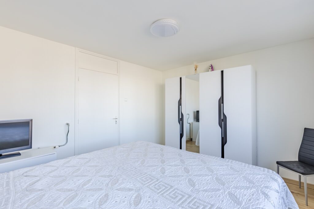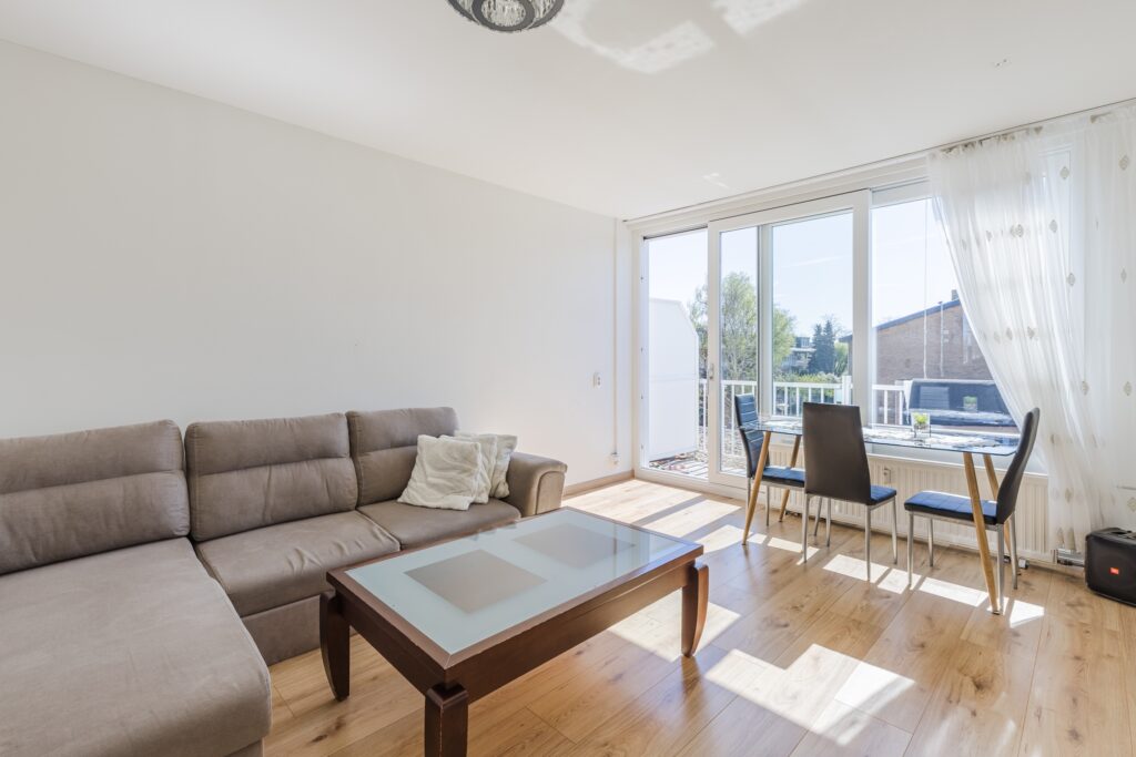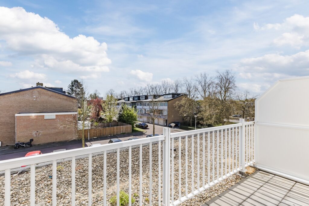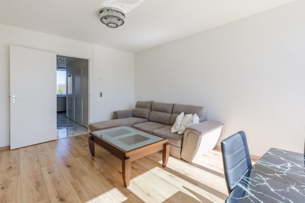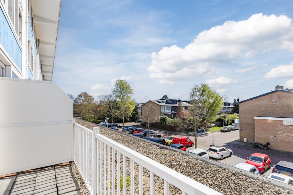 De ruime woonkamer is voorzien van een fraaie laminaatvloer. De wanden zijn hier keurig afgewerkt in rustige tinten. Dankzij de zeer brede raampartij met schuifdeur naar het balkon, is de woonruimte heerlijk licht. Het balkon ligt over de gehele breedte van het appartement en is netjes betegeld. Er is voldoende ruimte om meubilair te plaatsen, om zo ultiem van de zon en het uitzicht te genieten. Het balkon is aan beide kanten afgeschermd, waardoor je veel privacy ervaart.