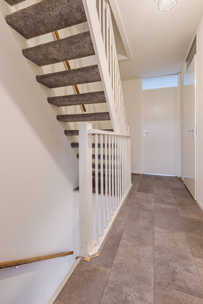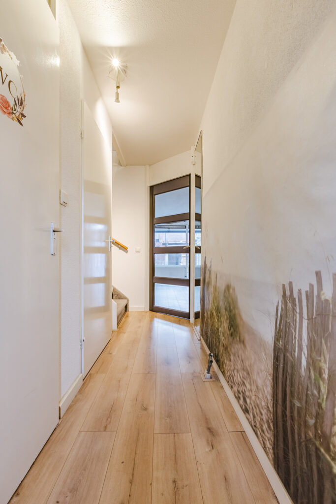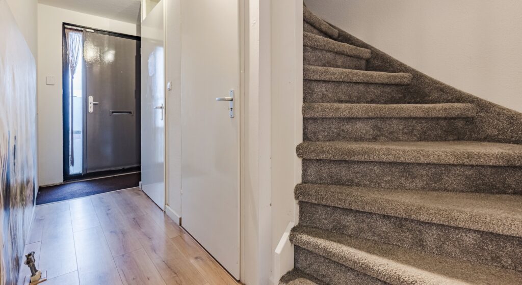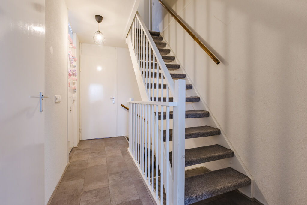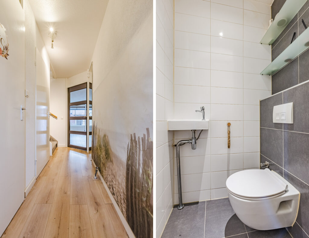 Na binnenkomst via de voordeur kom je eerst terecht in een fraaie entreehal. Hier vind je aan de linkerkant achtereenvolgens de meterkast, een aparte toiletruimte (met volledige betegeling, een vrijhangend closet met waterreservoir en een fonteintje), een grote trapkast en de trapopgang. Laatstgenoemde is voorzien van fijne, zachte trapbekleding.