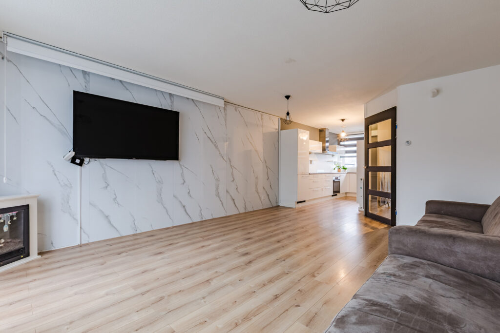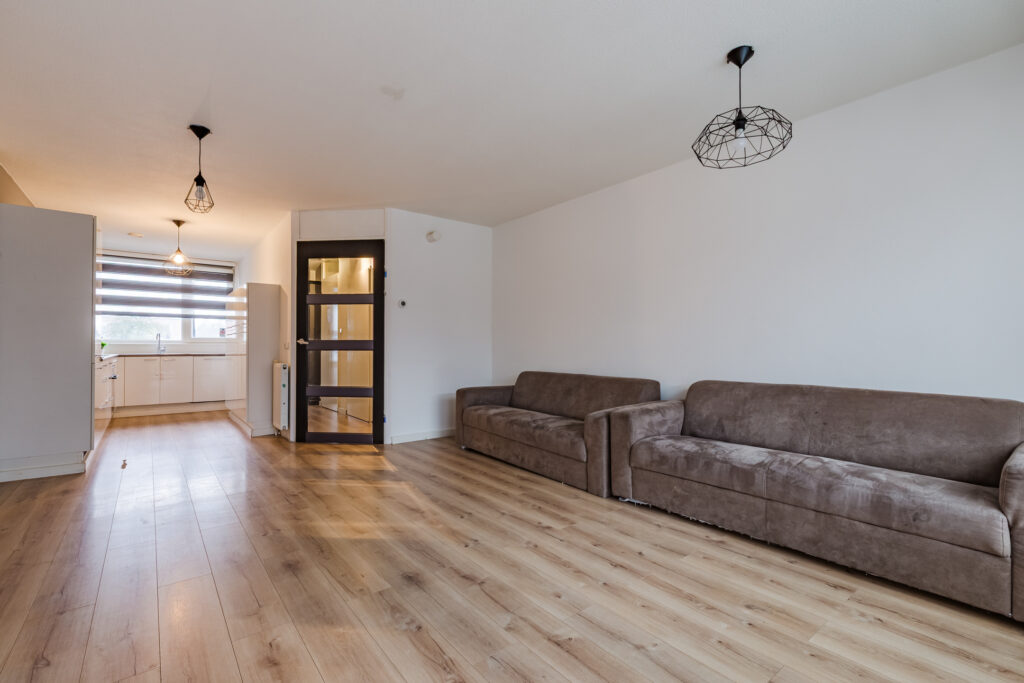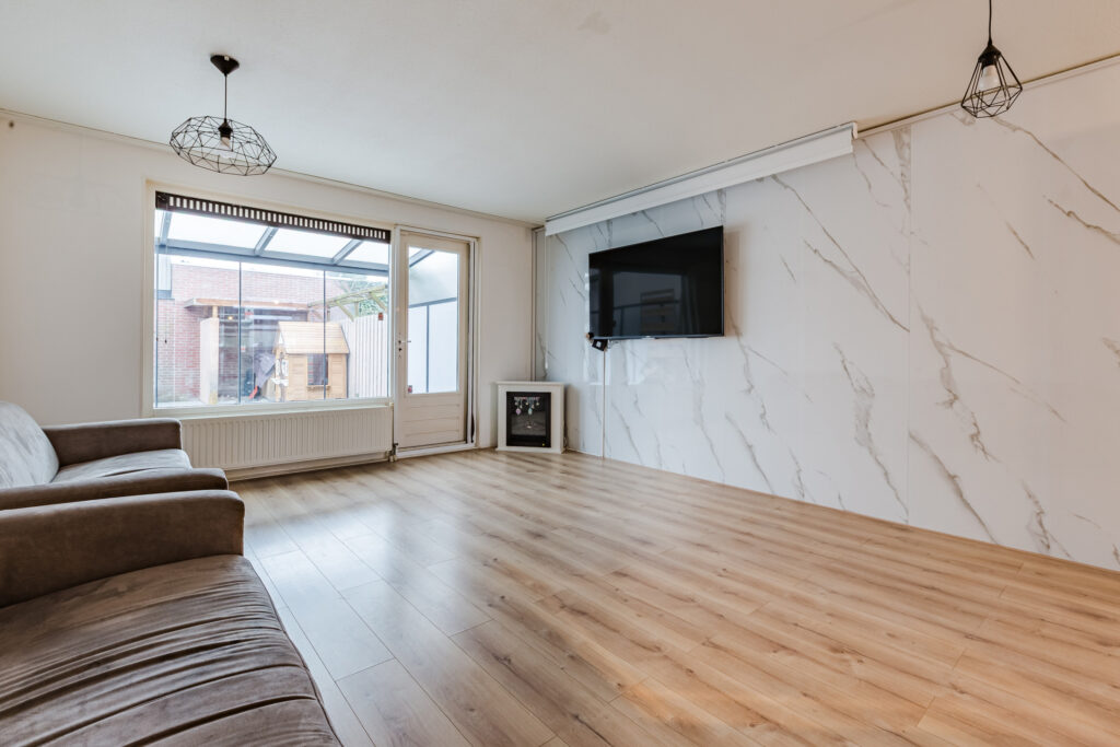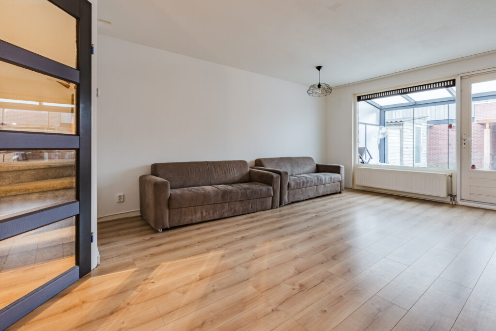 Aan het uiteinde van de entreehal vind je de mooie, grotendeels glazen toegangsdeur tot de woonkamer. Het gaat hier om een sfeervolle living die tuingericht is, met grote ramen op het zonnige zuidoosten. In de hoek van de woonkamer vind je een mooie houtkachel, terwijl het geheel verder is uitgerust met een keurige laminaatvloer.