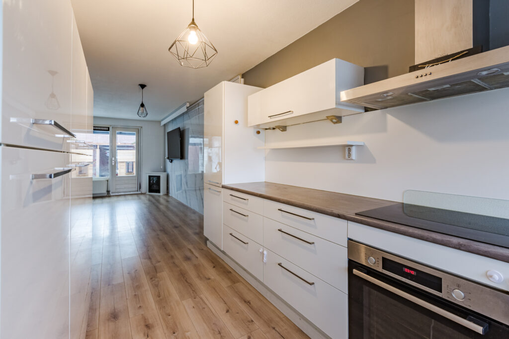 Richting de voorkant van de benedenverdieping is er vervolgens sprake van een mooie open keuken. Deze onderscheidt zich met een forse hoeveelheid werk- en opbergruimte. Kastruimte is er onder andere via diverse brede lades. Op het gebied van moderne inbouwapparatuur zijn een vaatwasser, oven, inductiekookplaat, afzuigsysteem, koelkast en vriezer voorhanden.