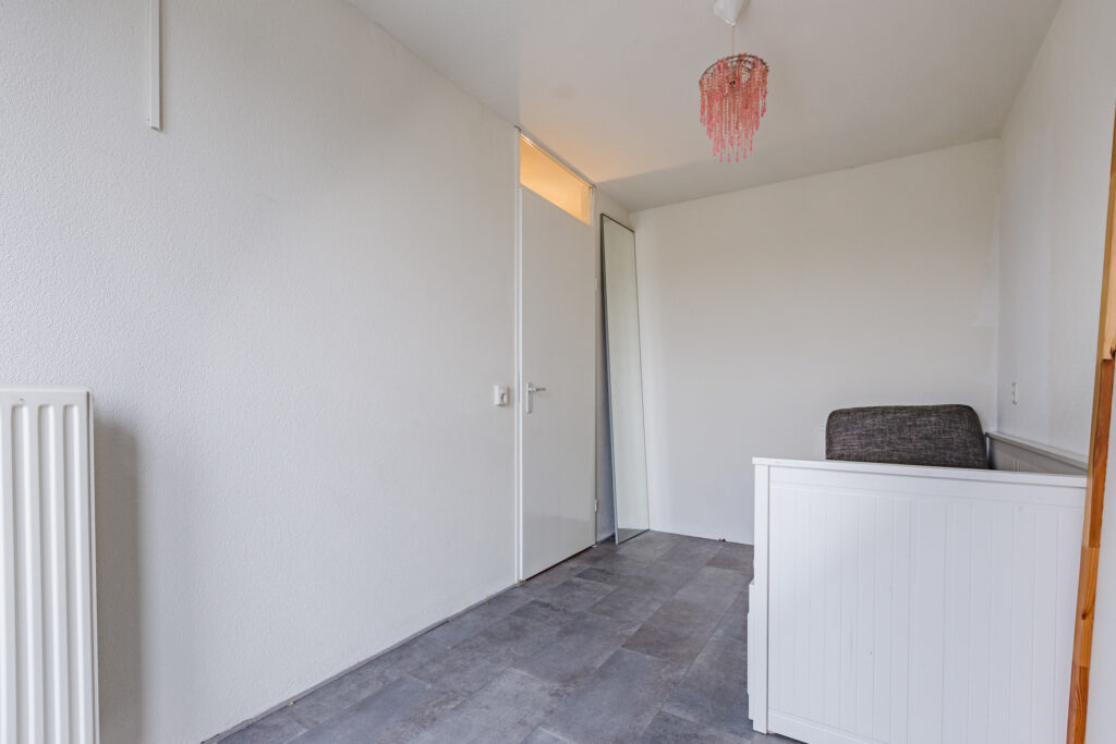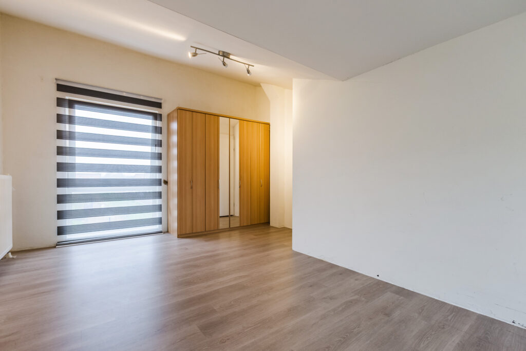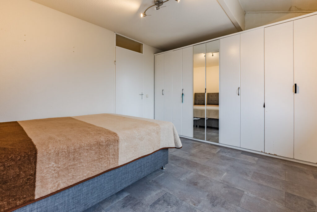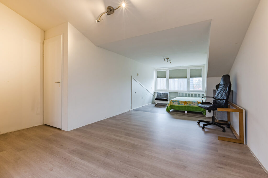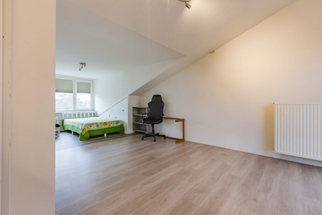 Vanuit de overloop van de eerste verdieping loopt een vaste trap verder naar boven. De bovenste etage bestaat vervolgens vrijwel volledig uit een prachtige zolderslaapkamer, die royaal van omvang is, ook omdat er aan de achterkant een mooie dakkapel is gerealiseerd. Aan die kant zijn langs de flanken bovendien verschillende op maat gemaakte inbouwkasten gecreëerd. De zolderslaapkamer is tenslotte keurig afgewerkt, onder andere met wederom een fraaie laminaatvloer.
