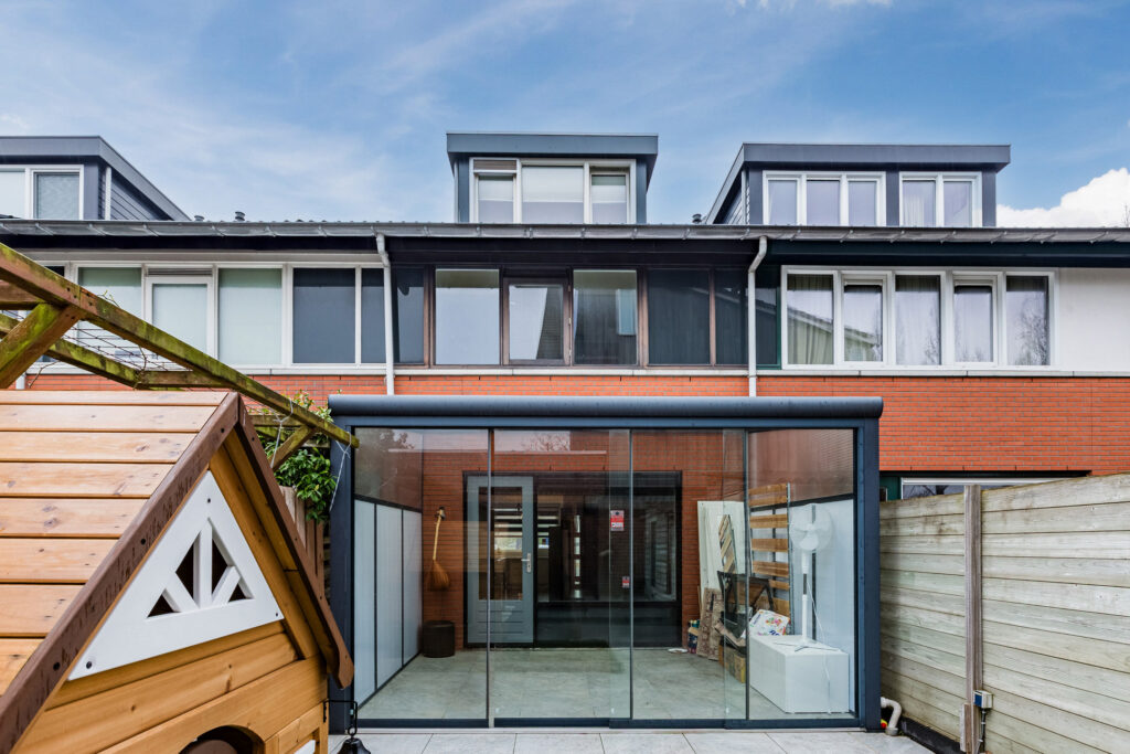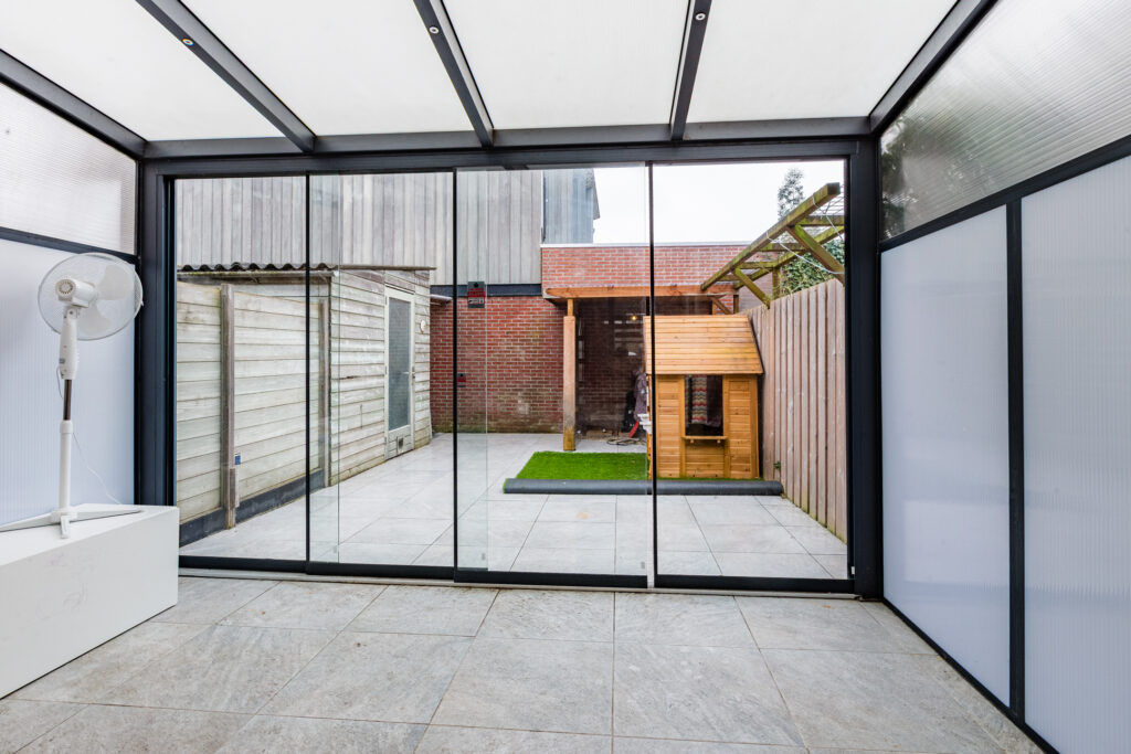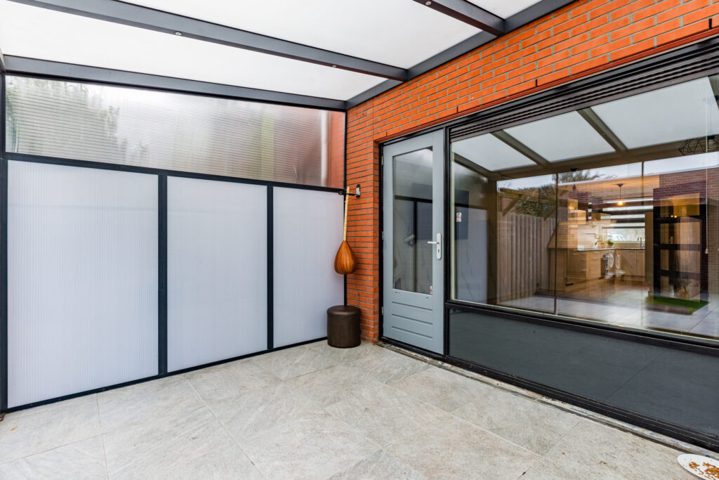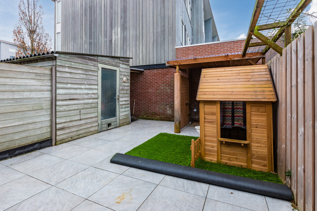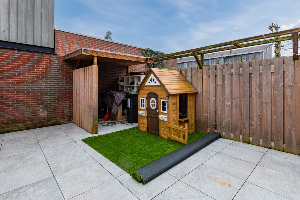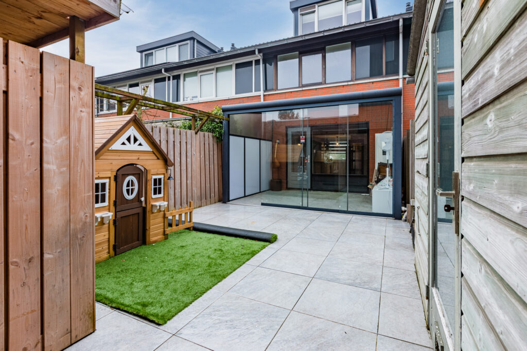 In de woonkamer is er sprake van een naar buiten openslaande tuindeur. Je komt dan echter niet meteen in de tuin terecht, maar in een prachtige, aangebouwde serre, met glazen schuifwanden die je helemaal kunt openen. In de serre kun je dan ook heerlijk beschut van het tuinleven genieten. Het buitengedeelte van de achtertuin, die op het zuidoosten is gericht, bestaat vervolgens vooral uit onderhoudsvriendelijke betegeling. Het geheel is verrijkt met een vrijstaande houten berging en een overkapte opbergruimte voor bijvoorbeeld tuingereedschappen en fietsen.