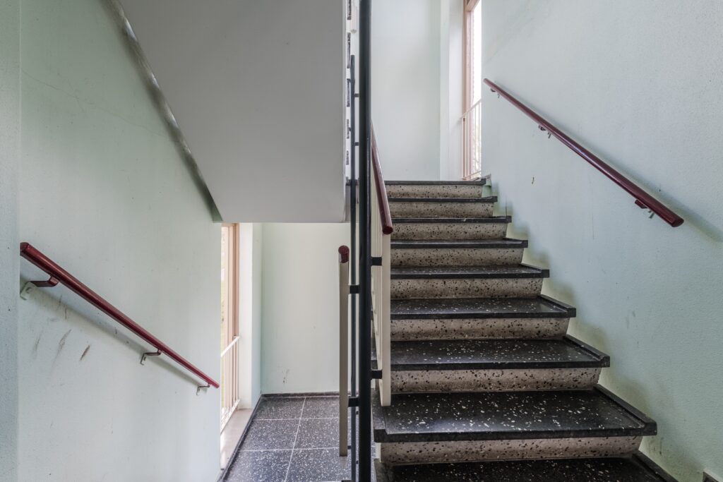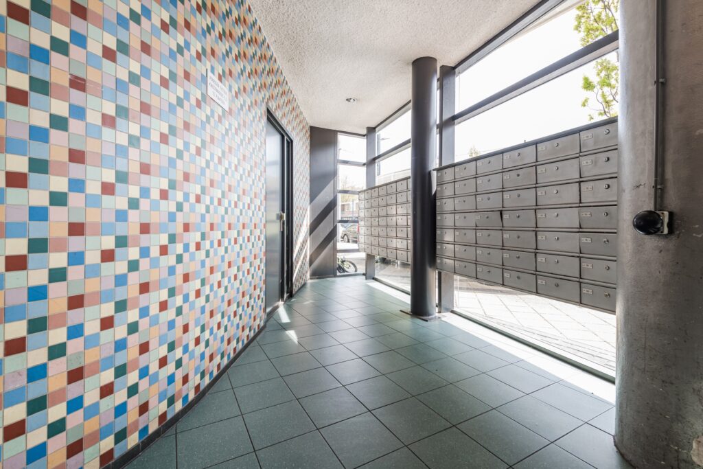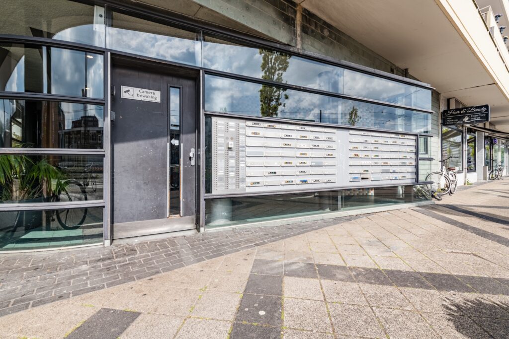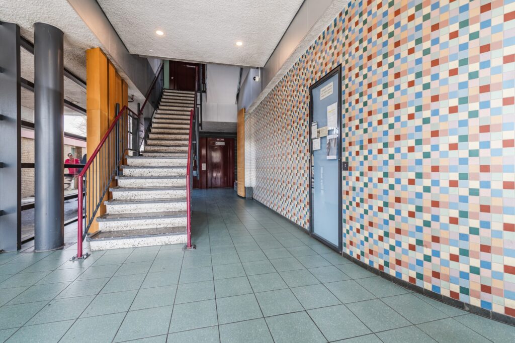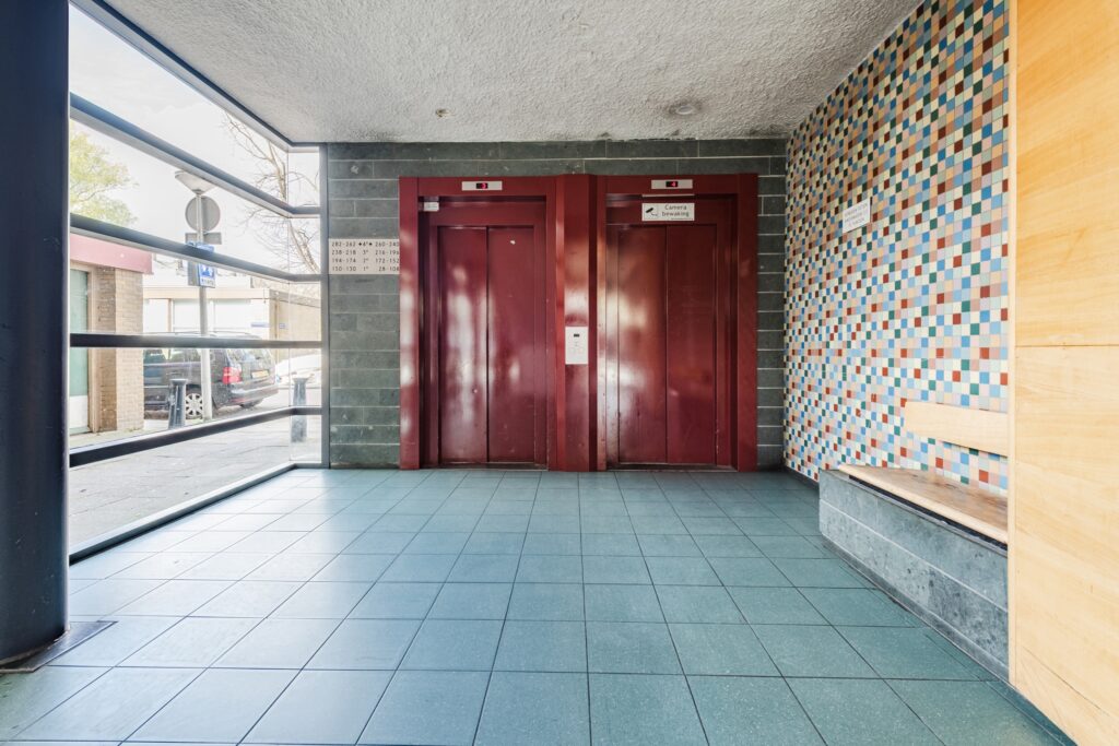 Gesloten entree met bel en intercom. Gemeenschappelijke hal met trappenhuis en lift.