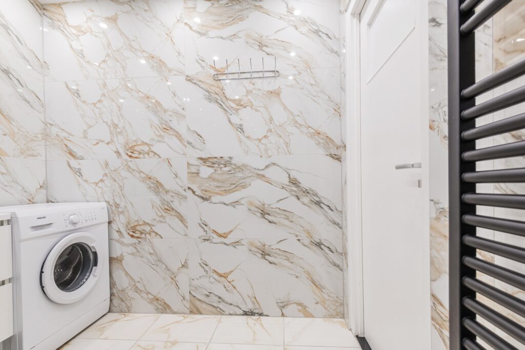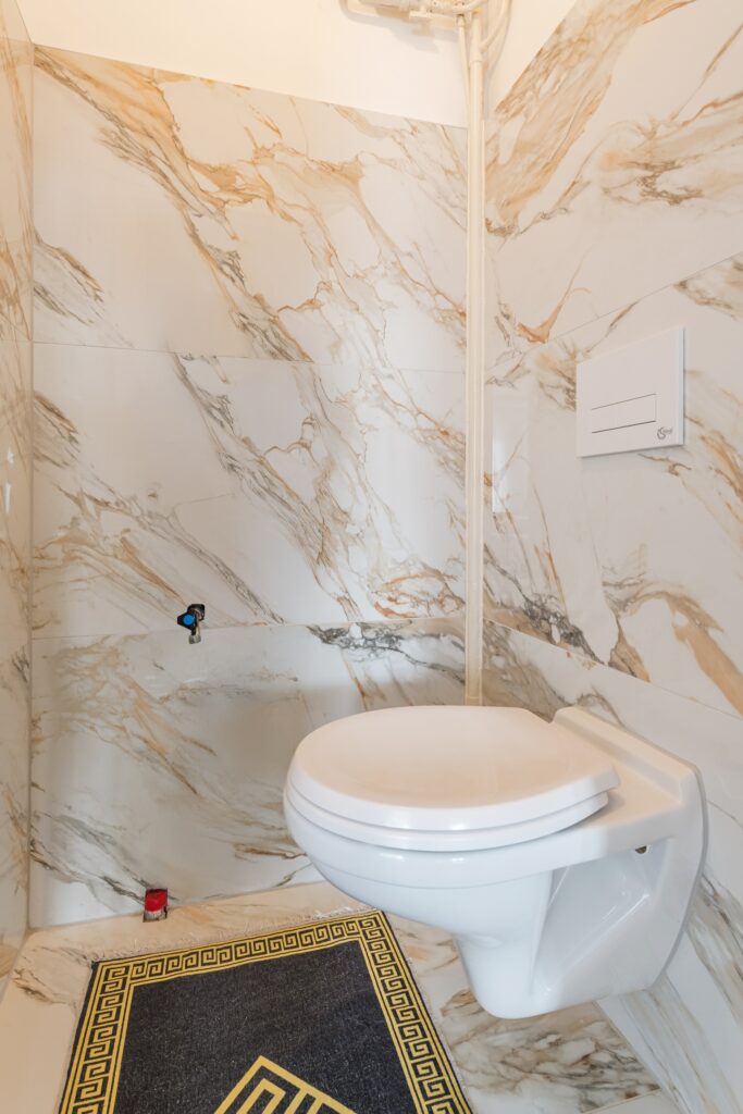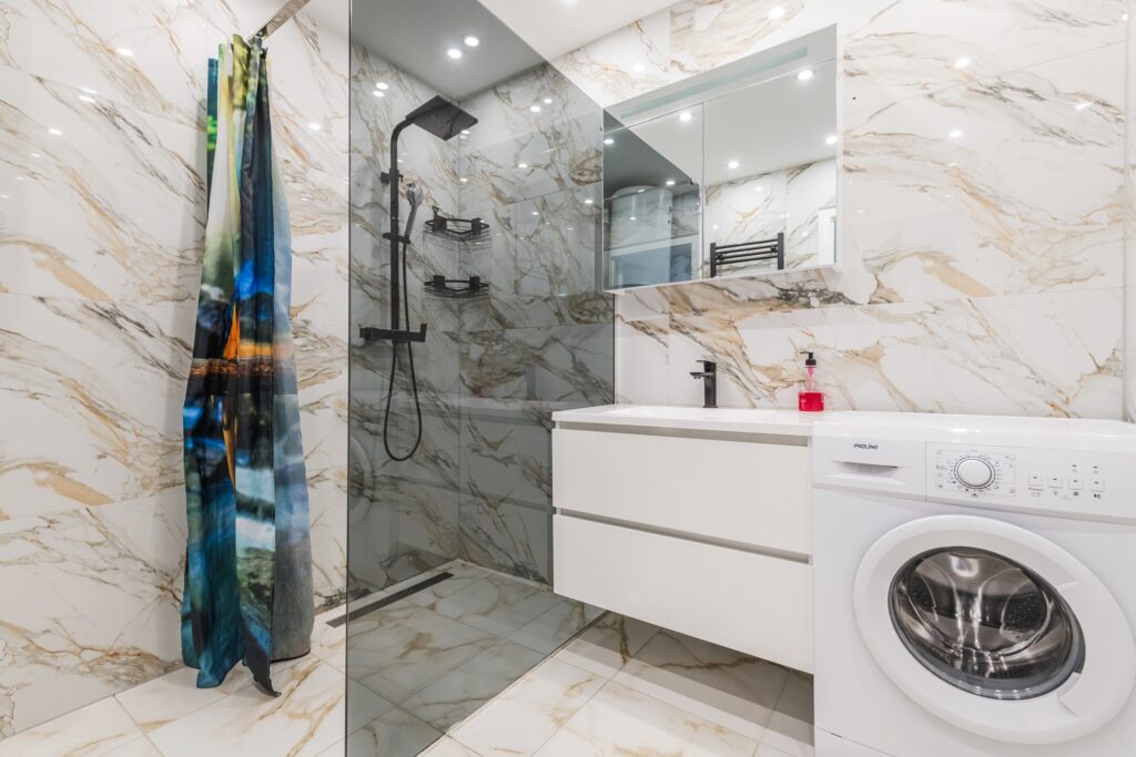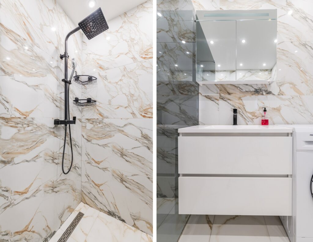De ruime badkamer van het appartement (2023) is prachtig betegeld en straalt veel luxe uit. De badkamer is uitgerust met een badmeubel met wastafel en grote inloopdouche met regendouche. Ook de wasmachine-aansluiting is hier te vinden. De ruimte wordt verlicht met inbouwspots. Aan de badkamer grenst een moderne toiletruimte met zwevend toilet en fonteintje (2023).