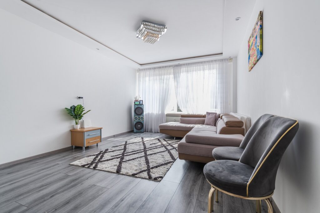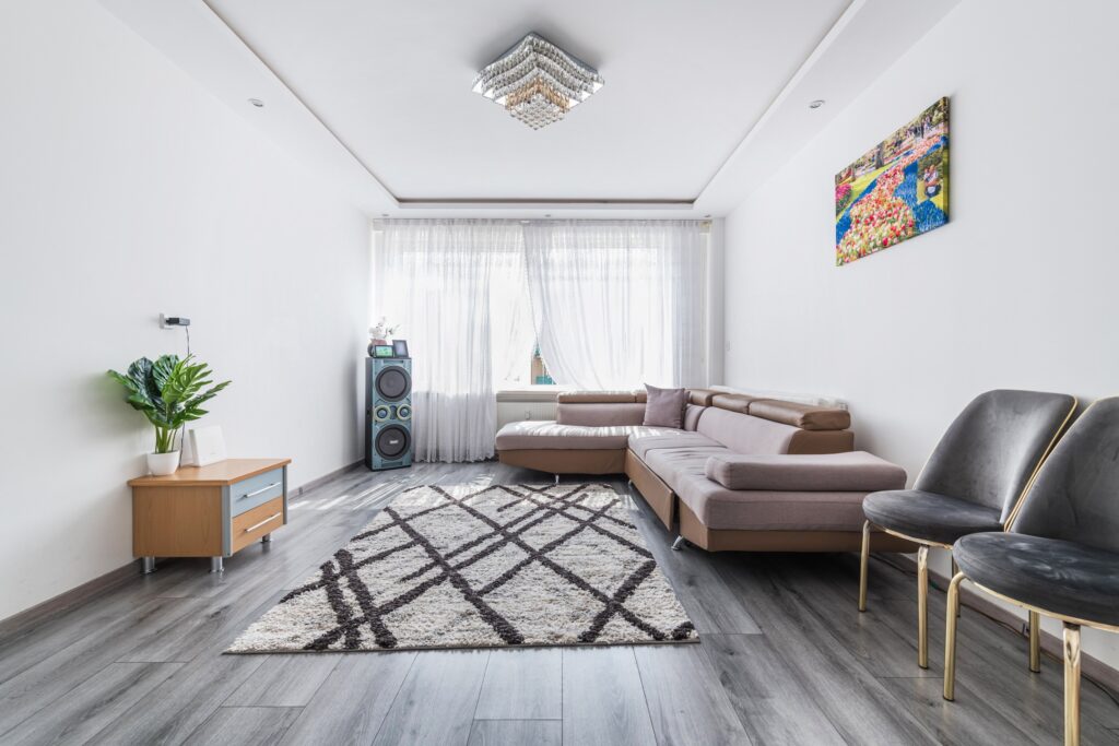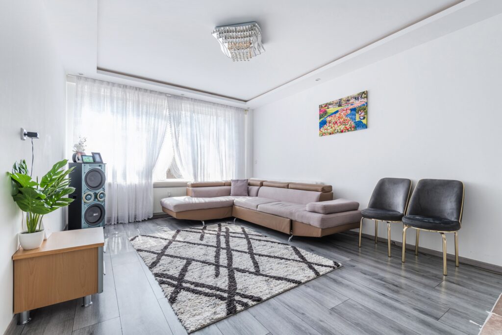 De ruime woonkamer is voorzien van een mooie laminaatvloer en glad stucwerk op de wanden. Dankzij de zeer brede raampartij komt er veel natuurlijk licht naar binnen. Verder wordt de woonkamer deels verlicht met inbouwspots.