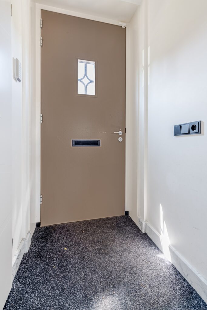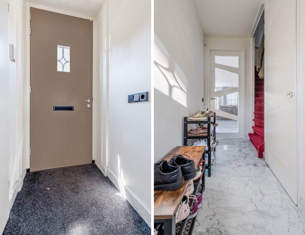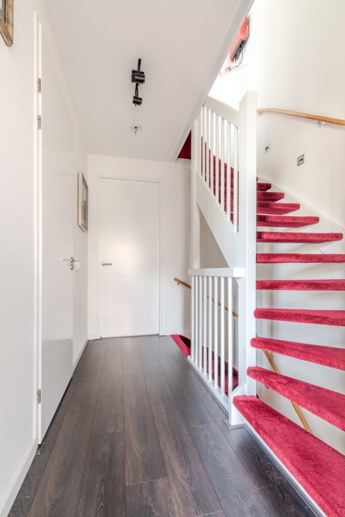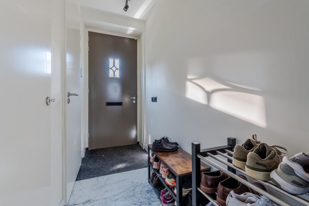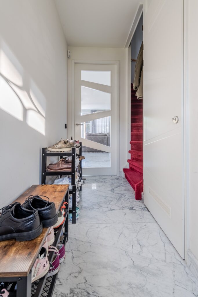 Via de betegelde voortuin bereik je de voordeur van deze fraaie hoekwoning. Na binnenkomst beland je in een netjes afgewerkte entreehal, die toegang biedt tot een moderne toiletruimte met zwevend toilet en fonteintje, de meterkast, trap naar boven en de woonkamer.