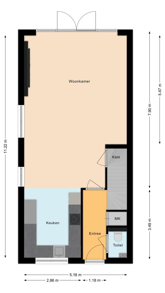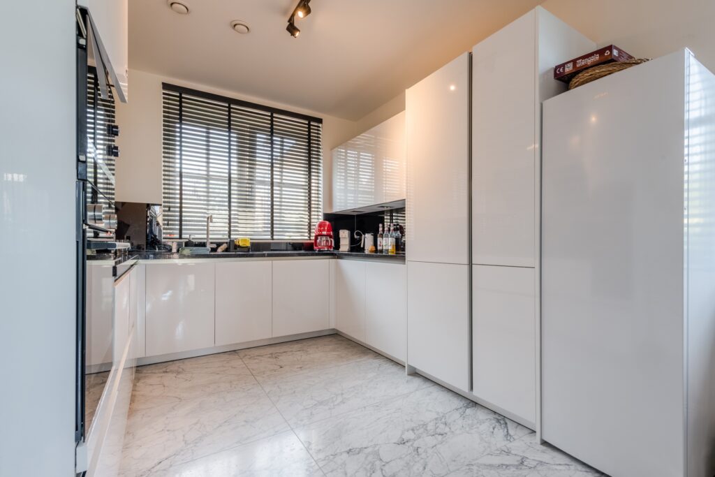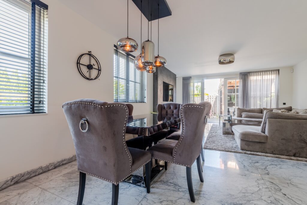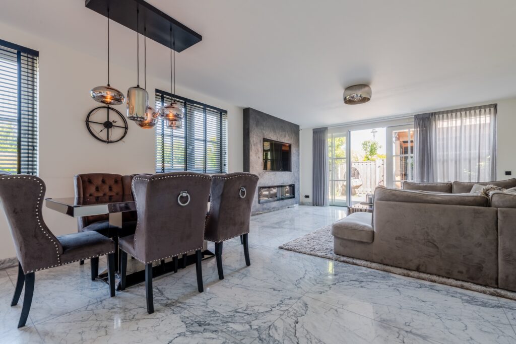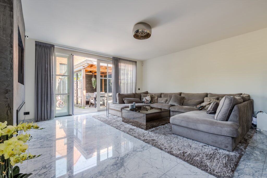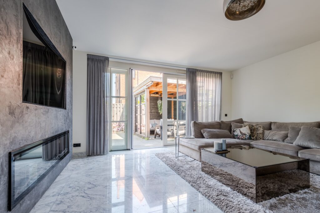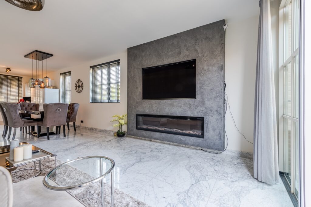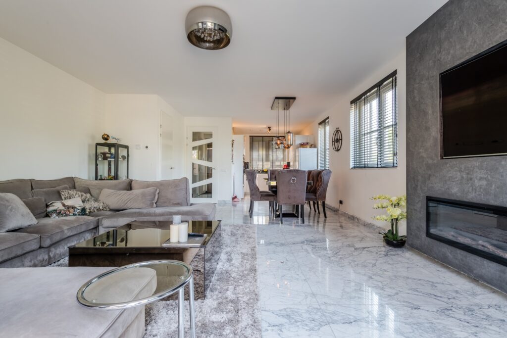 De volledige begane grond is prachtig afgewerkt met een marmervloer uit Italië. In de woonkamer zijn de wanden strak afgewerkt. Dankzij de openslaande tuindeuren en grote ramen is de woonruimte heerlijk licht. De prachtige sfeerhaard maakt de woonkamer extra gezellig. Via de woonkamer heb je toegang tot een praktische trapkast om spullen op te bergen.
