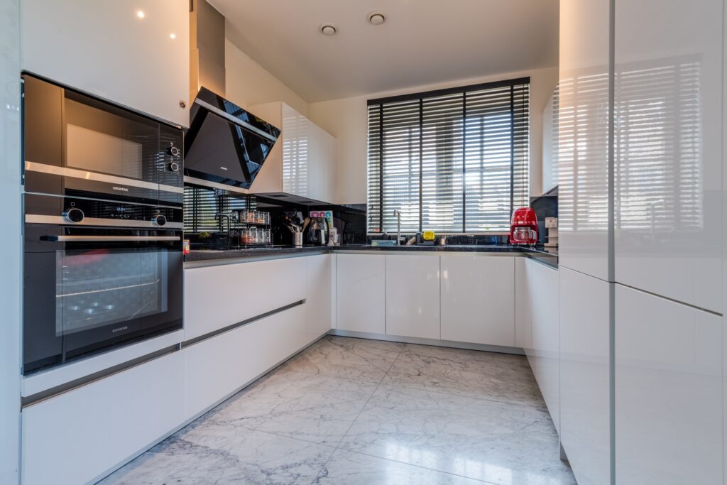 De open U-keuken heeft een fraai design met witte keukenkastjes en een donker werkblad. Deze keuken is uitgerust met moderne Siemens-apparatuur, waaronder een vaatwasser, oven, magnetron, inductie fornuis, koelkast en vriezer.