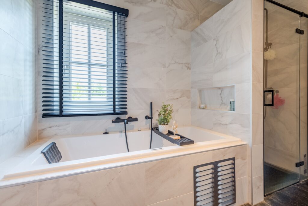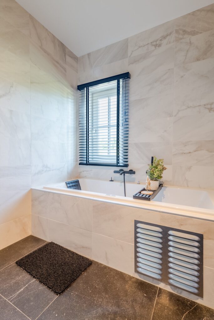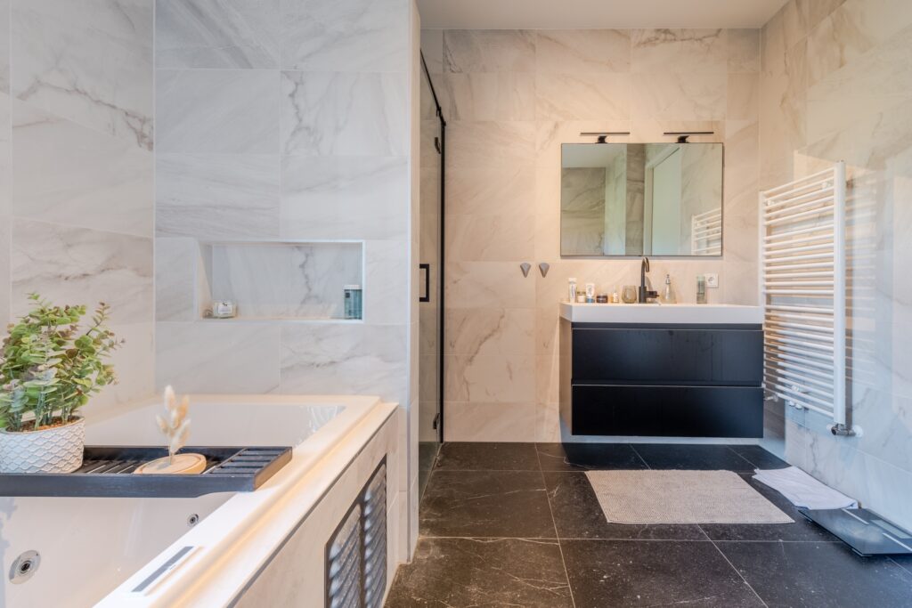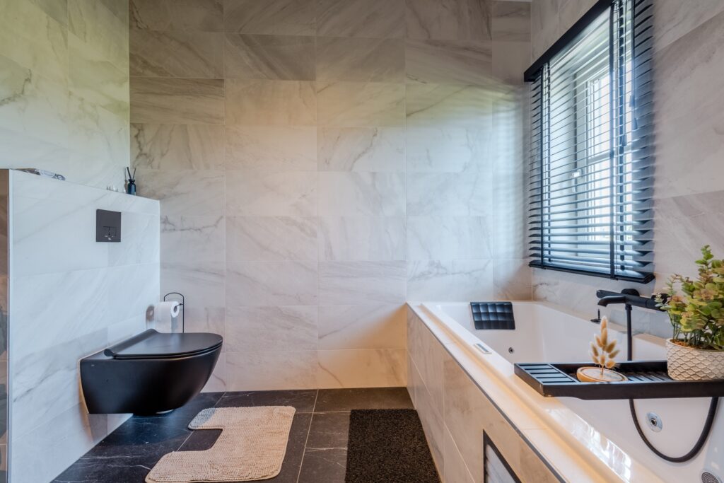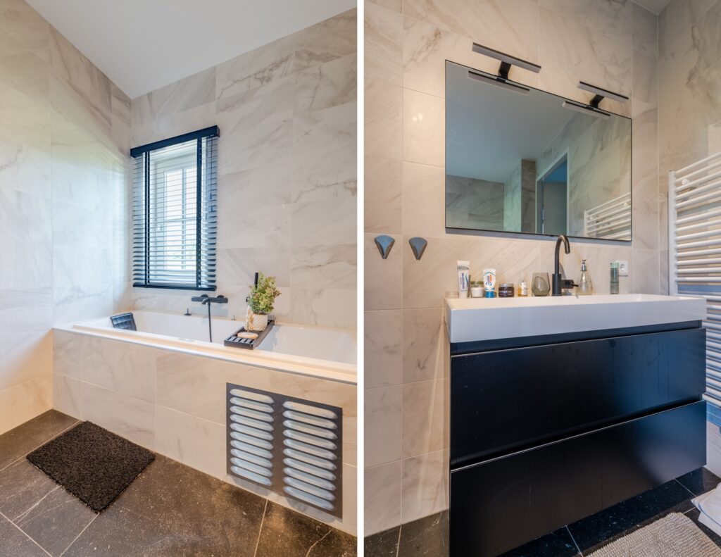 De ruime badkamer is voorzien van een mix van crèmekleurige en donkere tegels. De badkamer heeft een luxe uitstraling en is uitgerust met een zwevend toilet, badmeubel met wastafel, modern ligbad en inloopdouche.