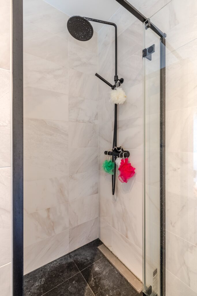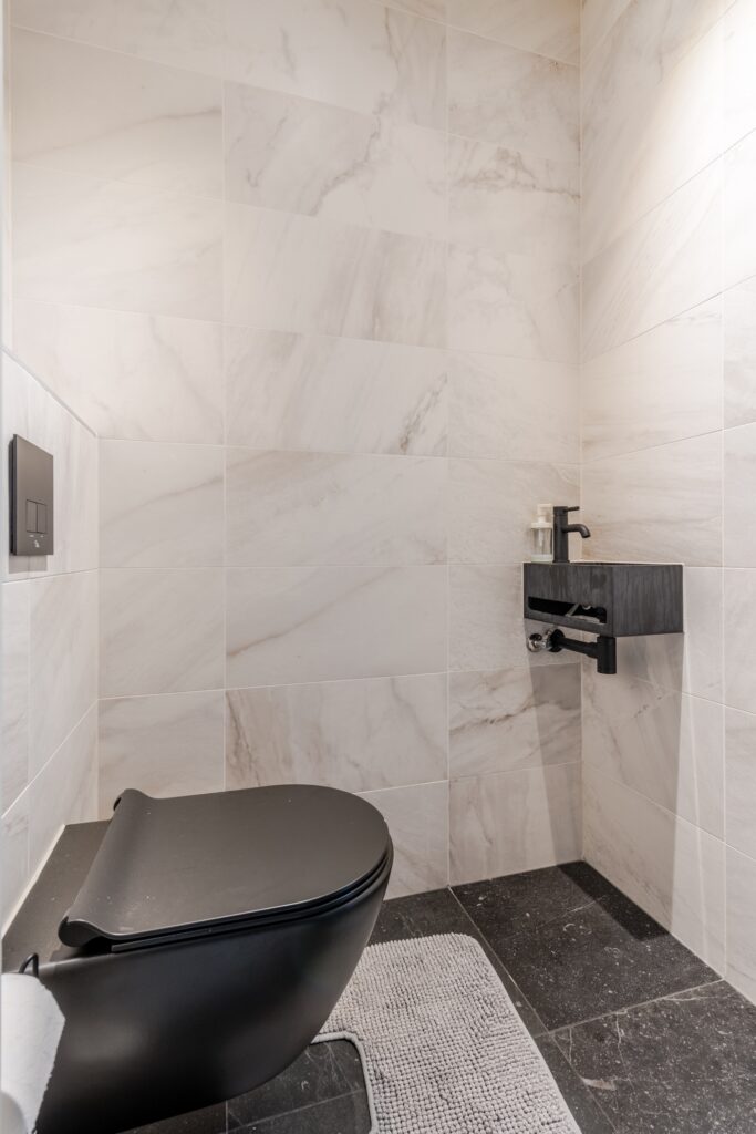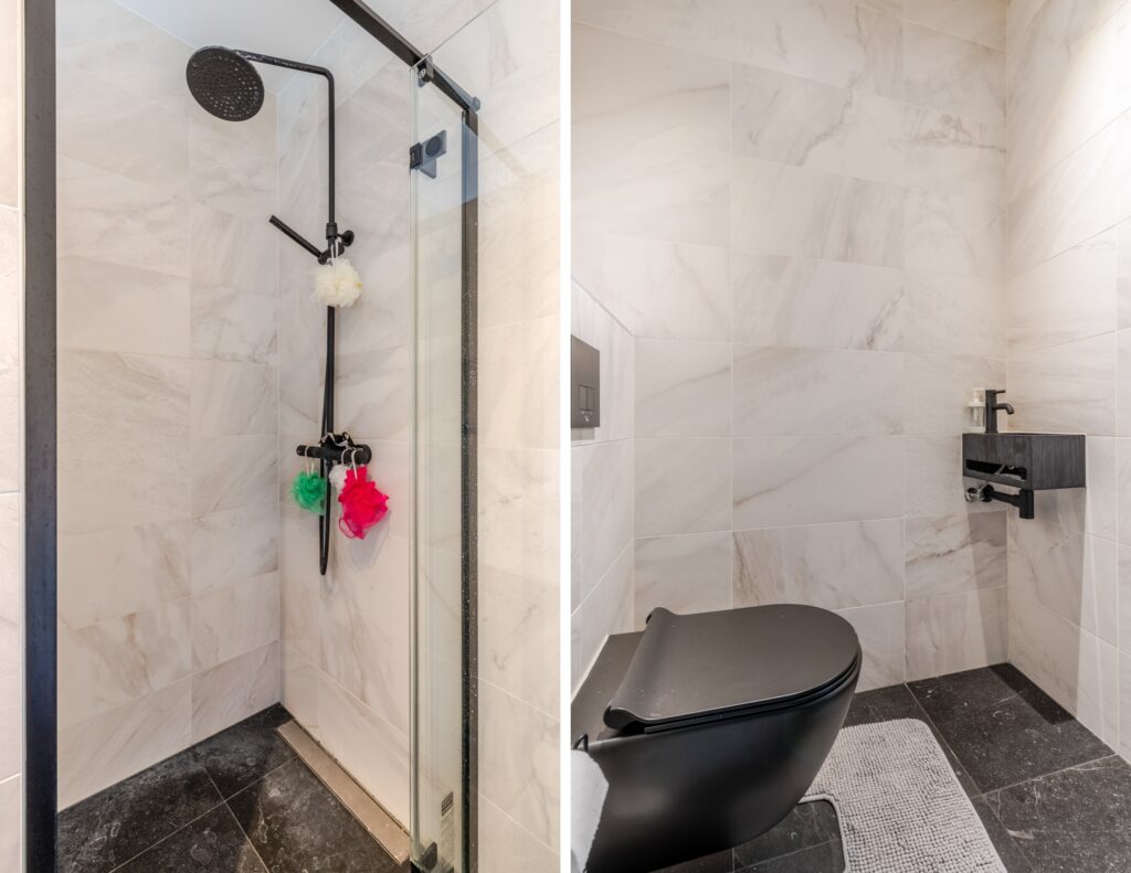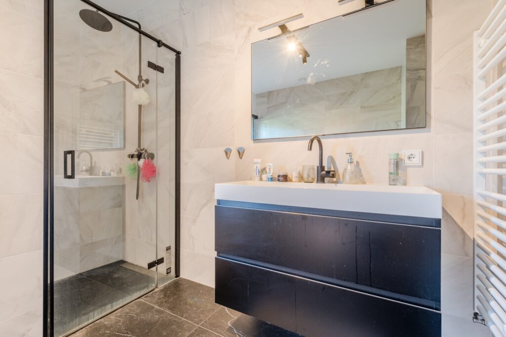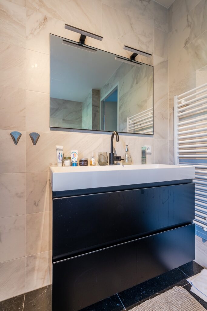 De ruime badkamer is voorzien van een mix van crèmekleurige en donkere tegels. De badkamer heeft een luxe uitstraling en is uitgerust met een zwevend toilet, badmeubel met wastafel, modern ligbad en inloopdouche.