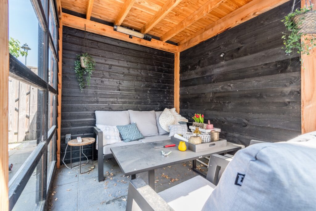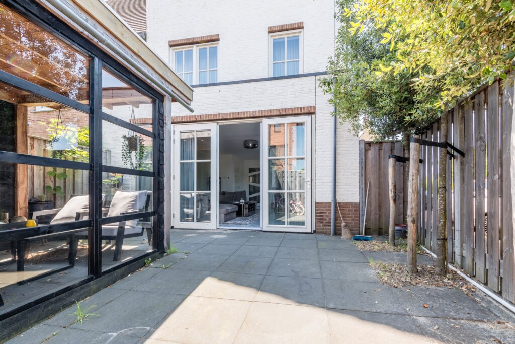 Het huis beschikt over een fraai aangelegde achtertuin. De tuin is netjes betegeld en uitstekend beschut door de houten schuttingen. Er is een mooie, houten veranda gebouwd in de tuin. Dit is een heerlijke plek om overdekt te loungen. De veranda is voorzien van heaters en elektra. Aan de veranda grenst een ruime berging, ideaal voor je tuinspullen en fietsen. Er is een achterom.